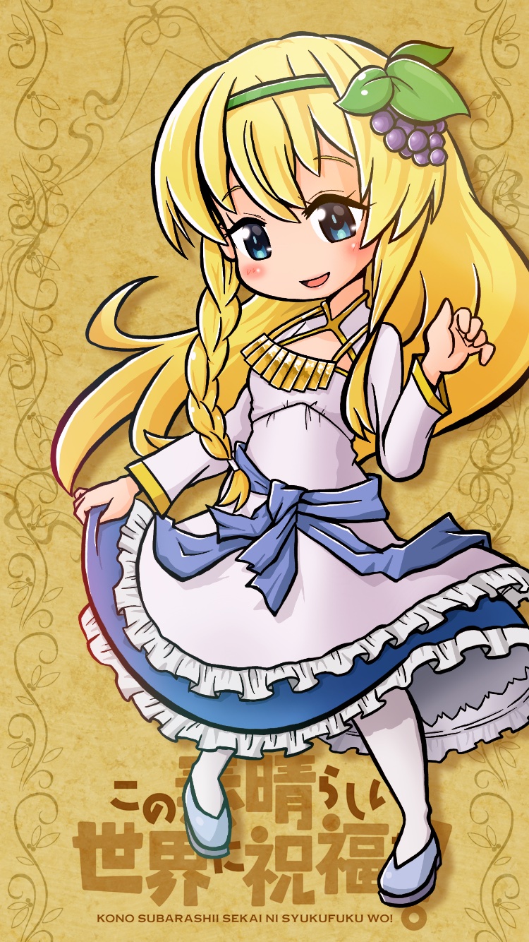 1girl asymmetrical_hair blonde_hair blue_eyes braid commentary_request copyright_name dress food-themed_hair_ornament gold_necklace gotthi grape_hair_ornament hair_ornament highres iris_(konosuba) jewelry kono_subarashii_sekai_ni_shukufuku_wo! long_hair necklace pigeon-toed side_braid single_braid skirt_under_dress solo very_long_hair white_dress yellow_background