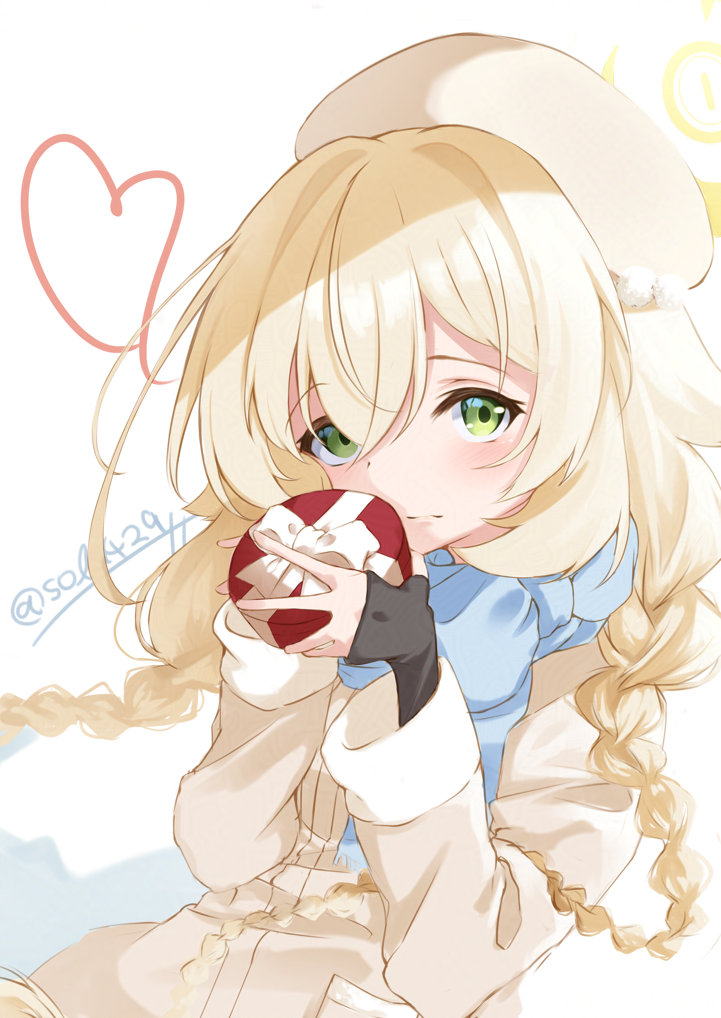 1girl absurdres beret blonde_hair blue_archive blue_scarf blush box box_of_chocolates braid chocolate closed_mouth coat commentary_request fingerless_gloves fluffy_hair food gift gift_box gloves green_eyes halo hat heart highres holding holding_gift long_hair looking_at_viewer professor_niyaniya_(blue_archive) scarf side_ahoge simple_background sola_(sola429) solo twitter_username upper_body valentine white_background yellow_coat yellow_halo yellow_hat