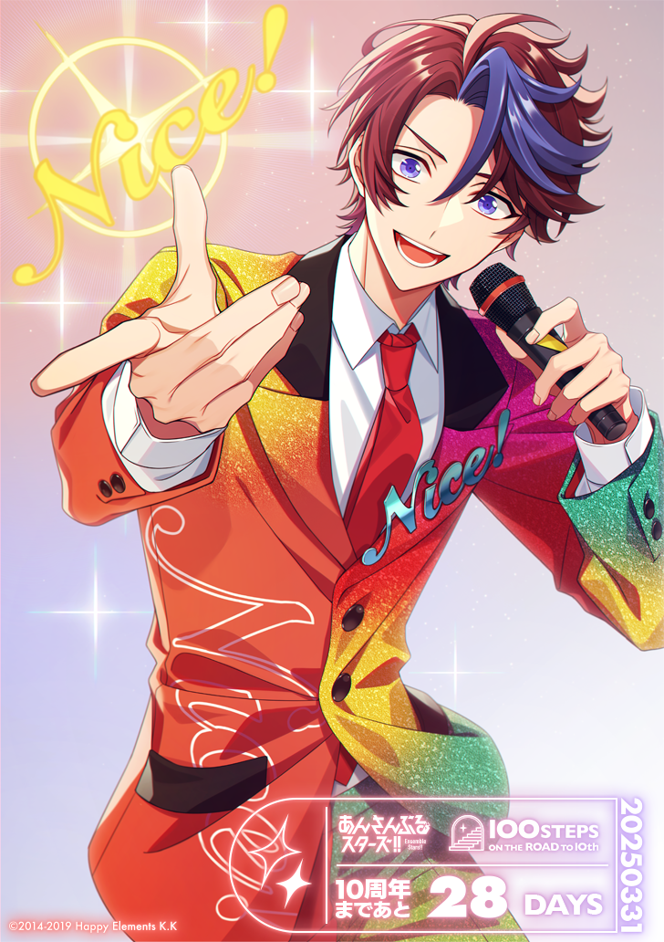 1boy blazer buttons character_name clothes_writing collared_shirt copyright_name copyright_notice countdown cowboy_shot curtained_hair dated ensemble_stars! fingernails glitter gradient_background grey_background hair_between_eyes hand_up head_tilt holding holding_microphone jacket lapels light_particles long_sleeves looking_at_viewer male_focus microphone multicolored_hair multicolored_jacket multicolored_pants music necktie notched_lapels official_art open_mouth orange_jacket pants parted_bangs pink_background pointing pointing_at_viewer purple_eyes purple_hair red_hair red_necktie shirt shirt_tucked_in short_hair singing solo sparkle standing turning_head two-tone_hair white_shirt wide-eyed y_at_(yuuya) yoshihide_sanda