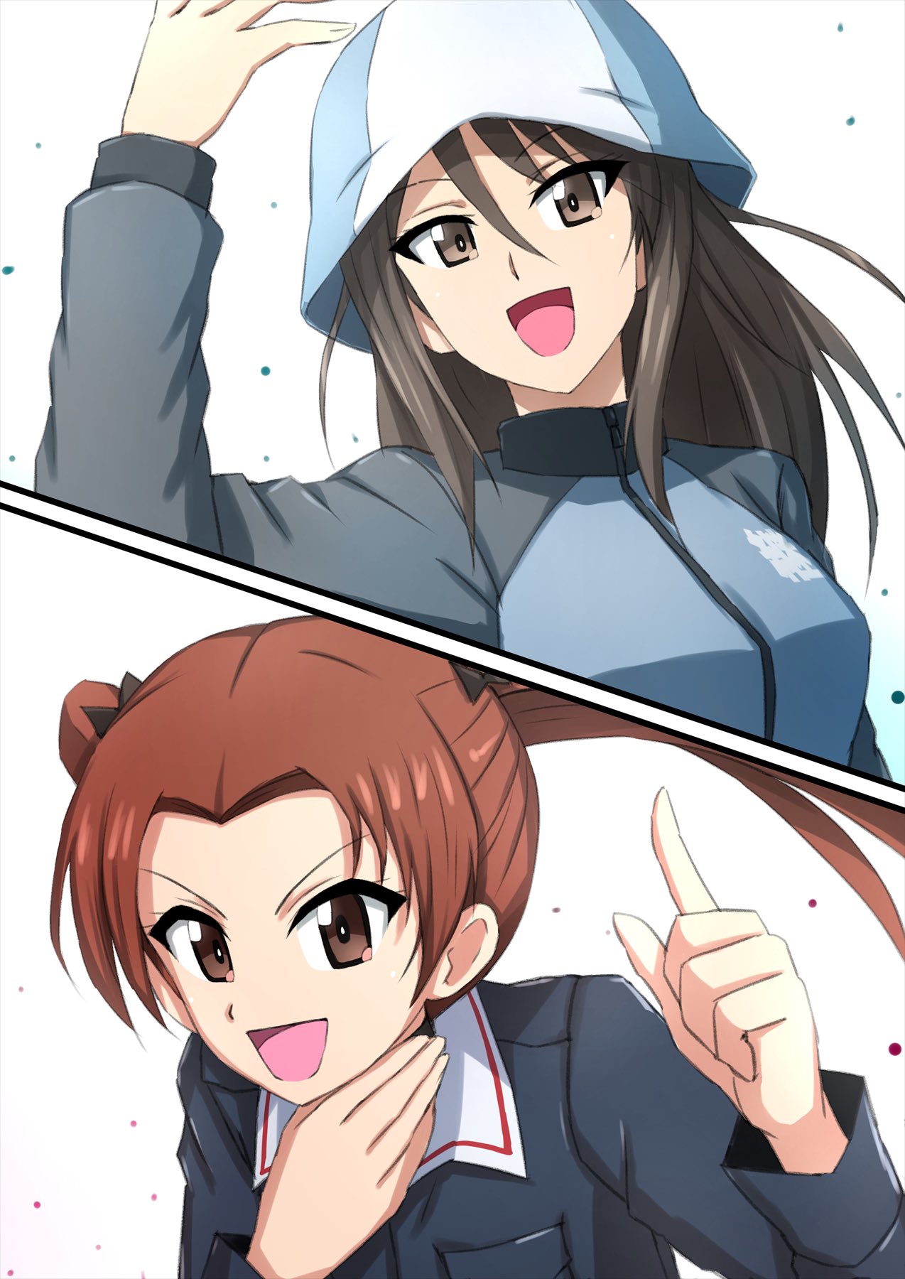 2girls black_bow blue_hat blue_jacket bow brown_eyes brown_hair commentary girls_und_panzer hair_bow hand_on_own_neck hat highres index_finger_raised jacket kadotani_anzu keizoku_military_uniform long_hair long_sleeves looking_at_viewer mika_(girls_und_panzer) military_uniform multiple_girls omachi_(slabco) ooarai_military_uniform open_mouth parted_bangs raglan_sleeves simple_background smile throat_microphone track_jacket tulip_hat twintails white_background