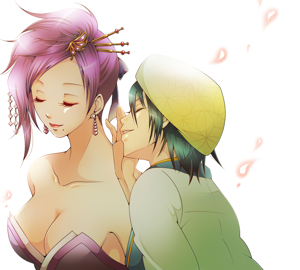 beret black_hair breasts butterfly_hair_ornament cleavage closed_eyes coat earrings eyelashes eyeshadow hair_ornament hair_ribbon hat japanese_clothes jewelry kimono large_breasts lips lipstick makeup no_(sengoku_musou) petals purple_hair ribbon sengoku_musou smile takenaka_hanbei_(sengoku_musou) whispering yukata