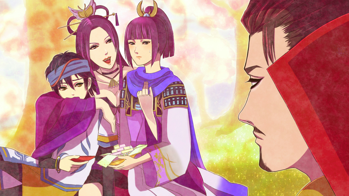 arm_around_another's_waist arm_around_shoulder armor beard black_hair breasts brown_eyes butterfly_hair_ornament choker cleavage facial_hair hair_ornament headband hug japanese_clothes jewelry kimono lips lipstick long_sleeves makeup mole mole_under_mouth mori_ranmaru_(sengoku_musou) mustache necklace no_(sengoku_musou) oda_nobunaga_(sengoku_musou) ponytail purple_hair sengoku_musou smile takenaka_hanbei_(sengoku_musou)