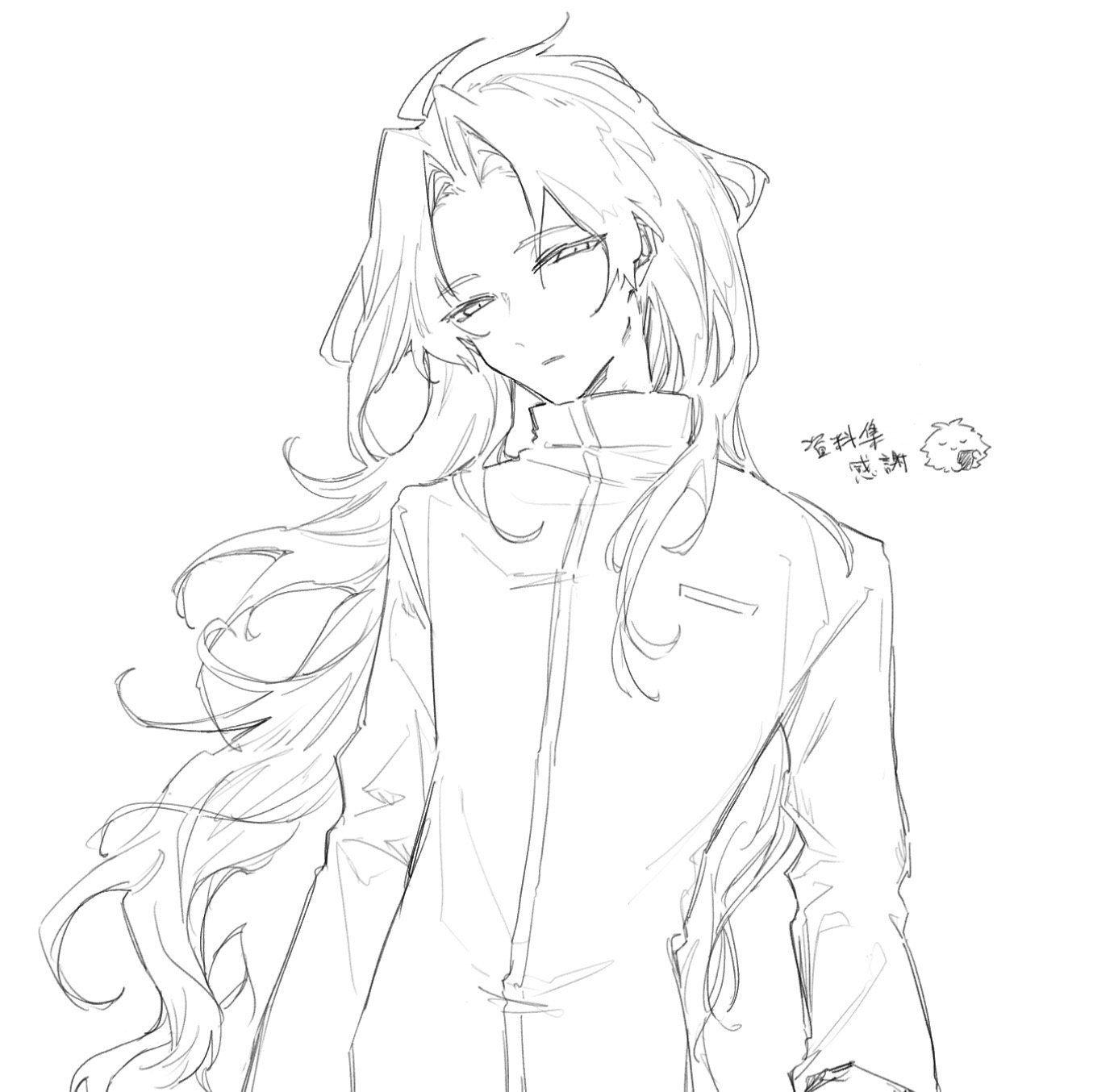 1boy ahoge arms_at_sides closed_mouth commentary_request cropped curtained_hair greyscale half-closed_eyes hatsutori_hajime head_tilt high_collar highres jacket long_hair long_sleeves looking_at_viewer male_focus mascot monochrome parted_bangs parted_lips poka_(user_kypt4454) saibou_shinkyoku simple_background sketch solo translation_request upper_body very_long_hair white_background
