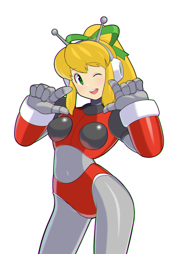 antennae armor armored_gloves arms_up bikini_armor blonde_hair blue_eyes bodysuit breasts covered_navel cowboy_shot green_ribbon hair_ribbon hairband hands_up headphones hyper_roll_(marvel_vs._capcom) hypericum_(mppv1862) joints large_breasts long_hair looking_at_viewer marvel_vs._capcom mechanical_arms mechanical_legs mega_man_(classic) mega_man_(series) navel one_eye_closed pointing pointing_at_self ponytail radio_antenna red_armor ribbon robot robot_girl robot_joints roll_(mega_man) shoulder_armor sidelocks simple_background smile teeth upper_teeth_only white_background