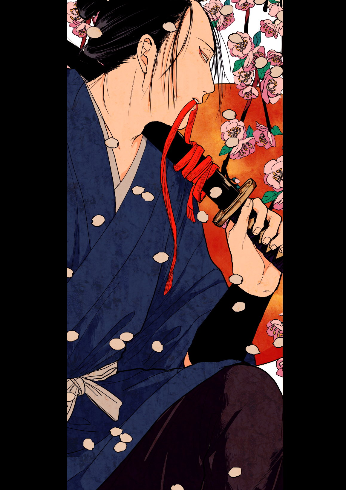 1boy black_hair blue_kimono cherry_blossoms flower highres holding holding_sword holding_weapon japanese_clothes katana kimono looking_to_the_side male_focus mouth_hold original pink_flower red_ribbon ribbon solo sword tamama163 weapon