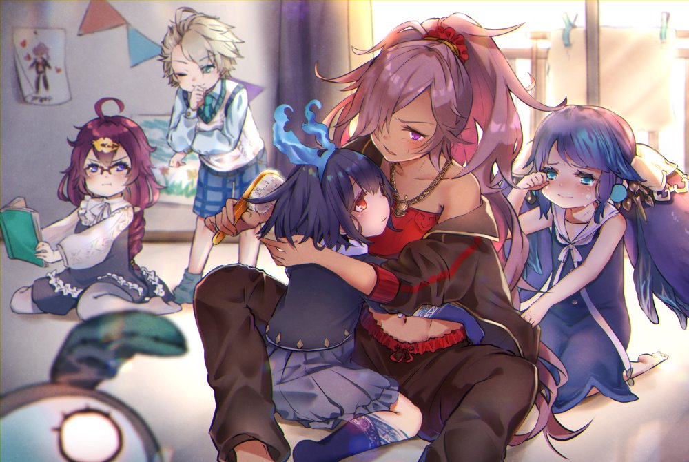 1boy 4girls ahoge aladdin_(sinoalice) alice_(sinoalice) angry arguing black_hair blue_eyes blue_hair blush book braid brushing_hair child cinderella_(sinoalice) collared_shirt comforting crop_top crying crying_with_eyes_open dark-skinned_female dark_skin dorothy_(sinoalice) earrings fins glasses green_necktie hair_ornament hair_over_one_eye hair_scrunchie hairband hairclip head_fins headdress holding holding_book hug indoors jacket jewelry kneeling kyashii_(a3yu9mi) long_sleeves multiple_girls navel necklace necktie ningyo_hime_(sinoalice) one_eye_closed pants pantyhose pink_hair plaid_clothes plaid_shorts ponytail puffy_long_sleeves puffy_sleeves purple_eyes purple_hair reading red_eyes ribbon sad school_uniform scrunchie shirt shorts sinoalice sitting smile stuffed_toy sweat sweatpants tears towel twintails window