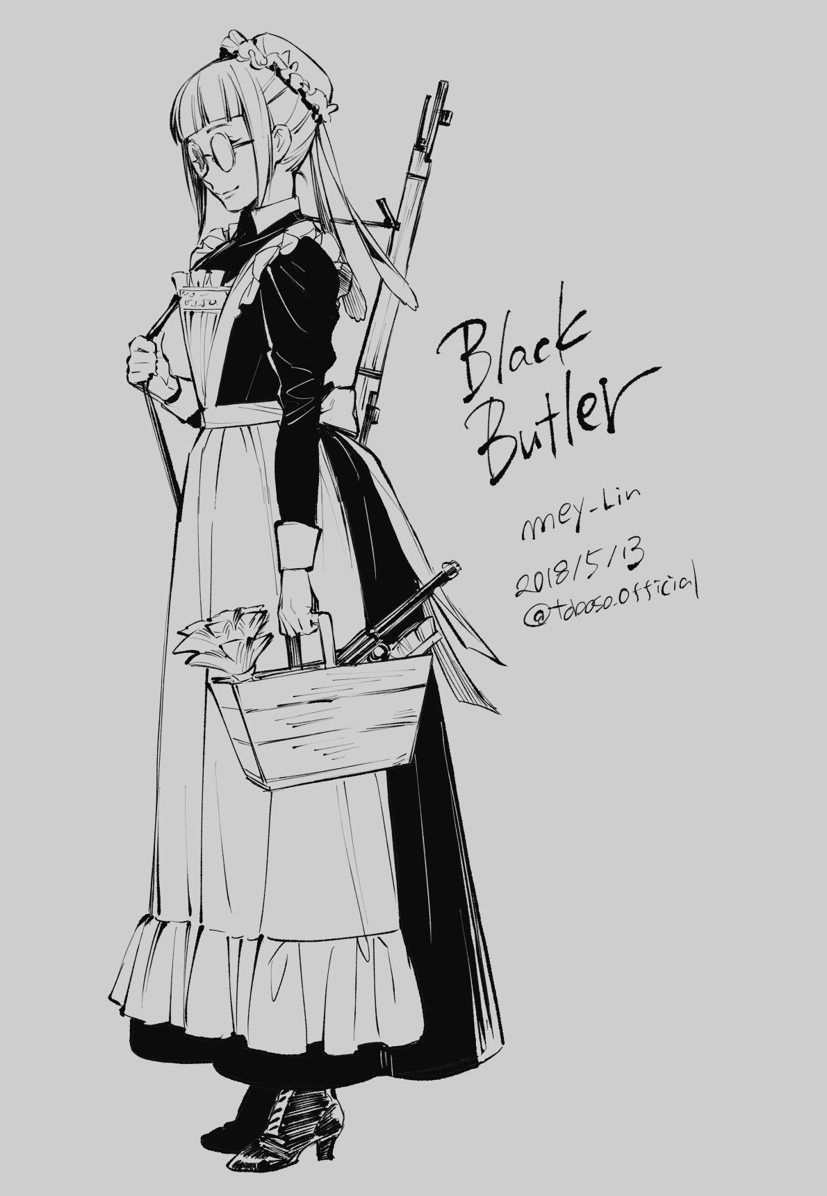 1girl apron basket black_dress blunt_bangs bun_cover character_name closed_mouth copyright_name dated dress frilled_apron frills full_body glasses grey_eyes greyscale gun hair_bun highres kuroshitsuji long_dress maid maid_headdress meirin_(kuroshitsuji) monochrome official_art rifle round_teeth shoes short_hair simple_background smile sniper_rifle solo standing teeth toboso_yana twitter_username weapon