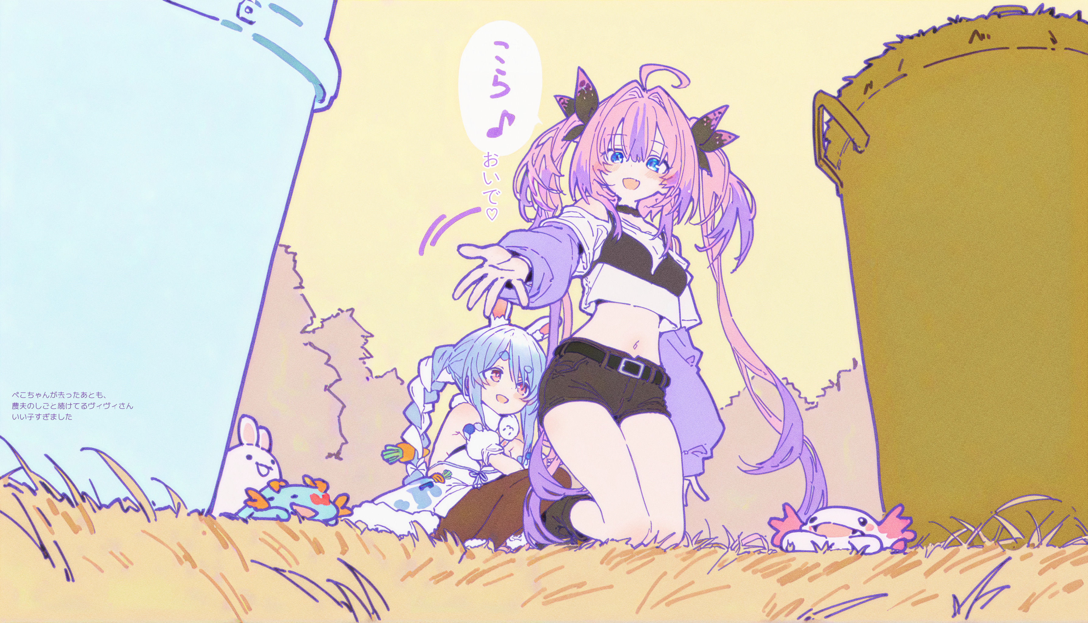 2girls absurdres ahoge animal_ear_fluff arm_warmers axolotl_(minecraft) belt black_bra blue_hair blush bow bra bra_over_clothes braid bucket carrot carrot_hair_ornament clothing_cutout coat_dress don-chan_(usada_pekora) dress female_focus food-themed_hair_ornament fur_scarf grass hair_bow hair_ornament highres hololive hololive_dev_is kikirara_vivi kneeling leotard leotard_under_clothes long_hair looking_at_another looking_at_viewer multicolored_hair multiple_girls musical_note navel nekonui open_mouth pantyhose purple_arm_warmers rabbit-shaped_pupils rabbit_ears rabbit_girl shirt shorts shoulder_cutout smile spoken_musical_note symbol-shaped_pupils thick_eyebrows translation_request twin_braids twintails two-tone_hair underwear usada_pekora usada_pekora_(1st_costume) virtual_youtuber white_shirt