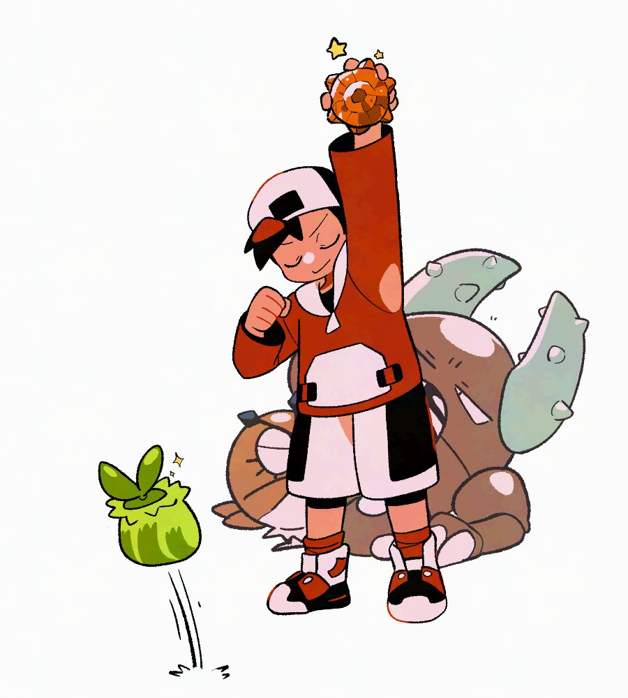 1boy arm_up clenched_hand closed_eyes closed_mouth commentary ethan_(pokemon) evolution_stone gen_1_pokemon gen_2_pokemon hat holding hoothoot jacket long_sleeves male_focus motion_lines nintendo pinsir pokemon pokemon_(creature) pokemon_gold/silver/crystal red_socks shirt shoes short_hair shorts smile socks sparkle star_(symbol) sun_stone_(pokemon) sunkern untranslatable_commentary tyako_089 white_background