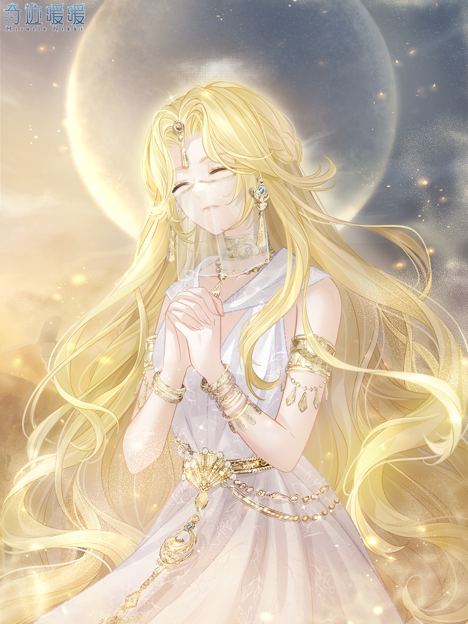 1girl armlet artist_request belt blonde_hair bracelet chain circlet closed_eyes copyright_name cowboy_shot desert dress earrings expressionless eyelashes full_moon game_cg gold_armlet gold_belt gold_bracelet gold_chain gold_earrings gold_necklace highres interlocked_fingers iriana_(miracle_nikki) jewelry light_particles logo long_dress long_hair miracle_nikki moon mouth_veil multiple_bracelets necklace nikki_(series) official_art outdoors own_hands_together pleated_skirt praying see-through_clothes see-through_veil sidelocks skirt sleeveless sleeveless_dress solo standing third-party_source twilight veil very_long_hair wavy_hair white_dress white_veil