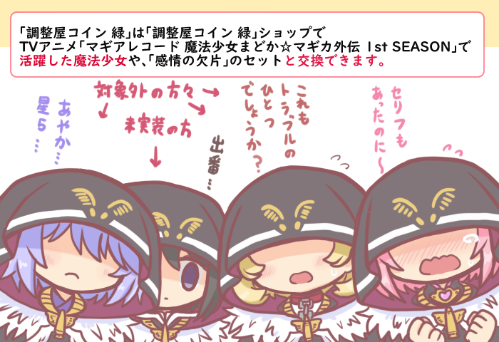 4girls bad_id bad_twitter_id black_hair blonde_hair blue_hair blush flying_sweatdrops hood hozumi_shizuku kuroe_(madoka_magica) magia_record:_mahou_shoujo_madoka_magica_gaiden mahou_shoujo_madoka_magica makino_ikumi multiple_girls nanase_yukika open_mouth pink_hair purple_eyes reverse_(bluefencer) short_hair wavy_mouth