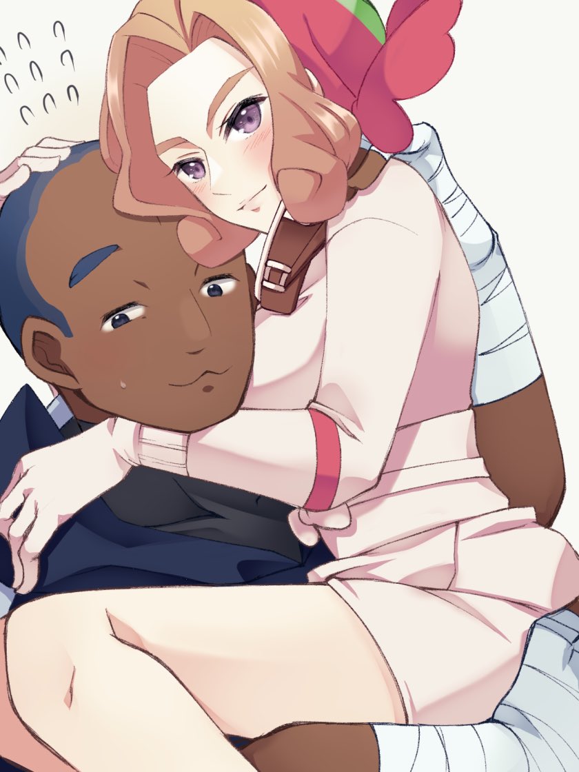 1boy 1girl arm_wrap blue_hair blush carrying carrying_person dark-skinned_male dark_skin diamond_clan_outfit flying_sweatdrops goggles goggles_around_neck hetero iscan_(pokemon) looking_at_viewer mochi_(g_mochi) nintendo palina_(pokemon) pearl_clan_outfit pokemon pokemon_legends:_arceus purple_eyes