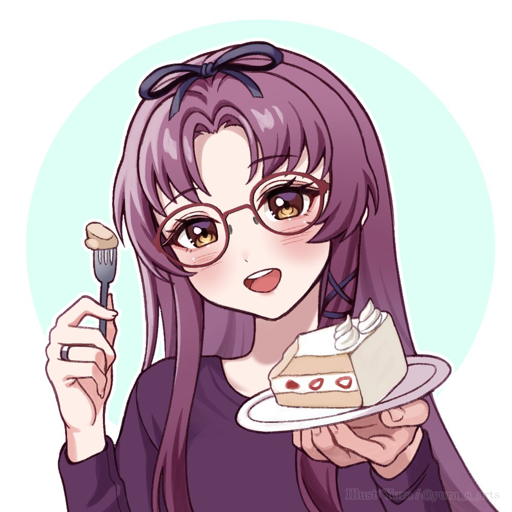 1girl artist_name blue_background blush border bow cake cake_slice commentary commission curtained_hair eiyuu_densetsu english_commentary food fork glasses hair_bow hajimari_no_kiseki holding holding_fork holding_plate long_hair looking_at_viewer open_mouth parted_bangs plate purple_hair renne_(eiyuu_densetsu) sen_no_kiseki_(series) sidelocks simple_background smile solo strawberry_shortcake twitter_username upper_body watermark white_border yellow_eyes yura_s_arts