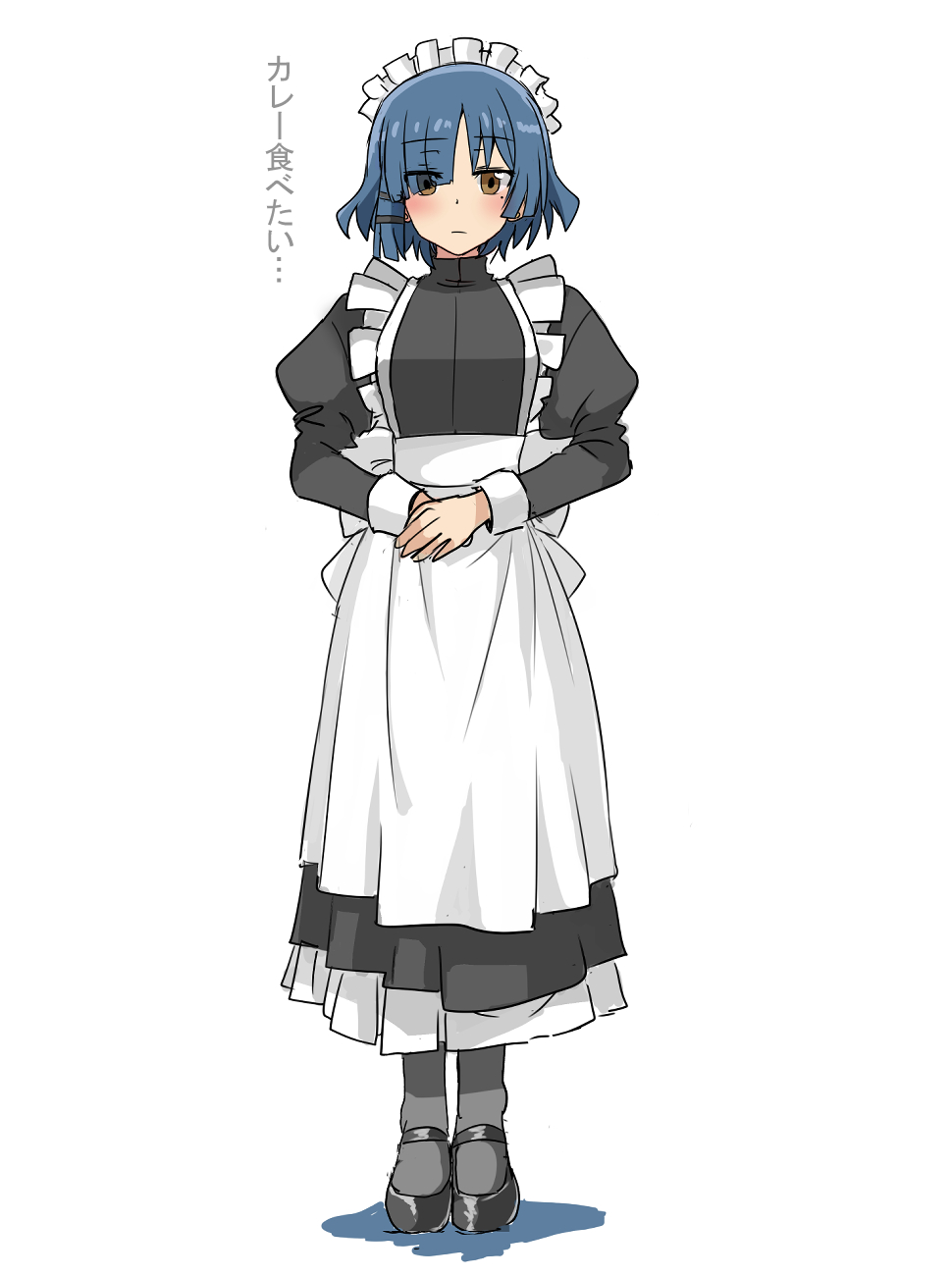 1girl apron black_dress black_shoes blue_hair bocchi_the_rock! brown_eyes dora_v_nu dress expressionless eyes_visible_through_hair grey_socks hair_ornament hair_over_one_eye hairclip highres juliet_sleeves long_dress long_sleeves maid maid_apron maid_headdress medium_hair mole mole_under_eye puffy_sleeves shoes socks solo translation_request yamada_ryo