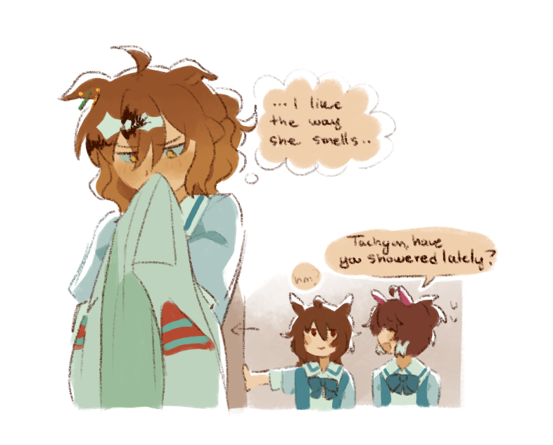 3girls 4byssopel4gic agnes_tachyon_(tach-nology)_(umamusume) agnes_tachyon_(umamusume) ahoge animal_ears blue_bow blue_bowtie blue_shirt bow bowtie braid brown_hair coat colored_speech_bubble commentary dantsu_flame_(umamusume) ears_down english_commentary english_text half_up_half_down_braid holding holding_coat holding_unworn_clothes horse_ears horse_girl implied_yuri jungle_pocket_(umamusume) lab_coat looking_at_another multiple_girls sailor_collar sailor_shirt school_uniform shirt short_sleeves smelling smelling_clothes speech_bubble summer_uniform thought_bubble tracen_school_uniform umamusume unworn_coat yellow_eyes