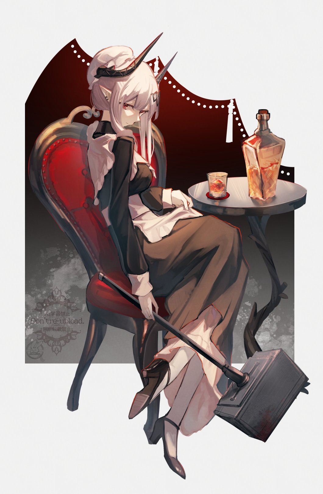 1girl alternate_costume apron arknights black_dress black_horns black_shoes breasts chair cognac cup double-parted_bangs dress drinking_glass earrings enmaided frilled_headwear from_side grey_background hair_ornament hammer hat hemorina highres holding holding_hammer horns jewelry large_breasts light_smile long_dress long_sidelocks maid maid_apron maid_day medium_hair mob_cap mudrock_(arknights) on_chair pointy_ears red_eyes rocks_glass shoes sidelocks sideways_glance sitting solo strappy_heels table white_apron white_hair