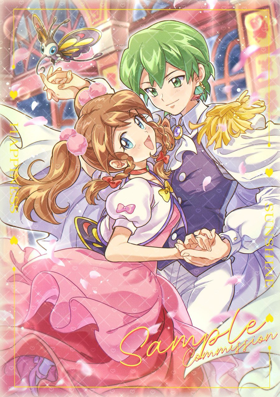 1boy 1girl :d arm_up beautifly black_shirt blue_eyes blush brooch brown_hair choker commission dancing dress drew_(pokemon) english_text gem gen_3_pokemon green_eyes green_hair hair_ornament highres holding_hands indoors jacket jewelry long_hair long_sleeves looking_at_another looking_at_viewer may_(pokemon) nintendo open_clothes open_jacket open_mouth pants pink_dress pokemon pokemon_(anime) pokemon_the_series:_ruby_and_sapphire pom_pom_(clothes) pom_pom_hair_ornament puffy_short_sleeves puffy_sleeves purple_gem red_choker shirt short_hair short_sleeves smile sparkle suzuki_(2red_moon3) twintails white_jacket white_pants