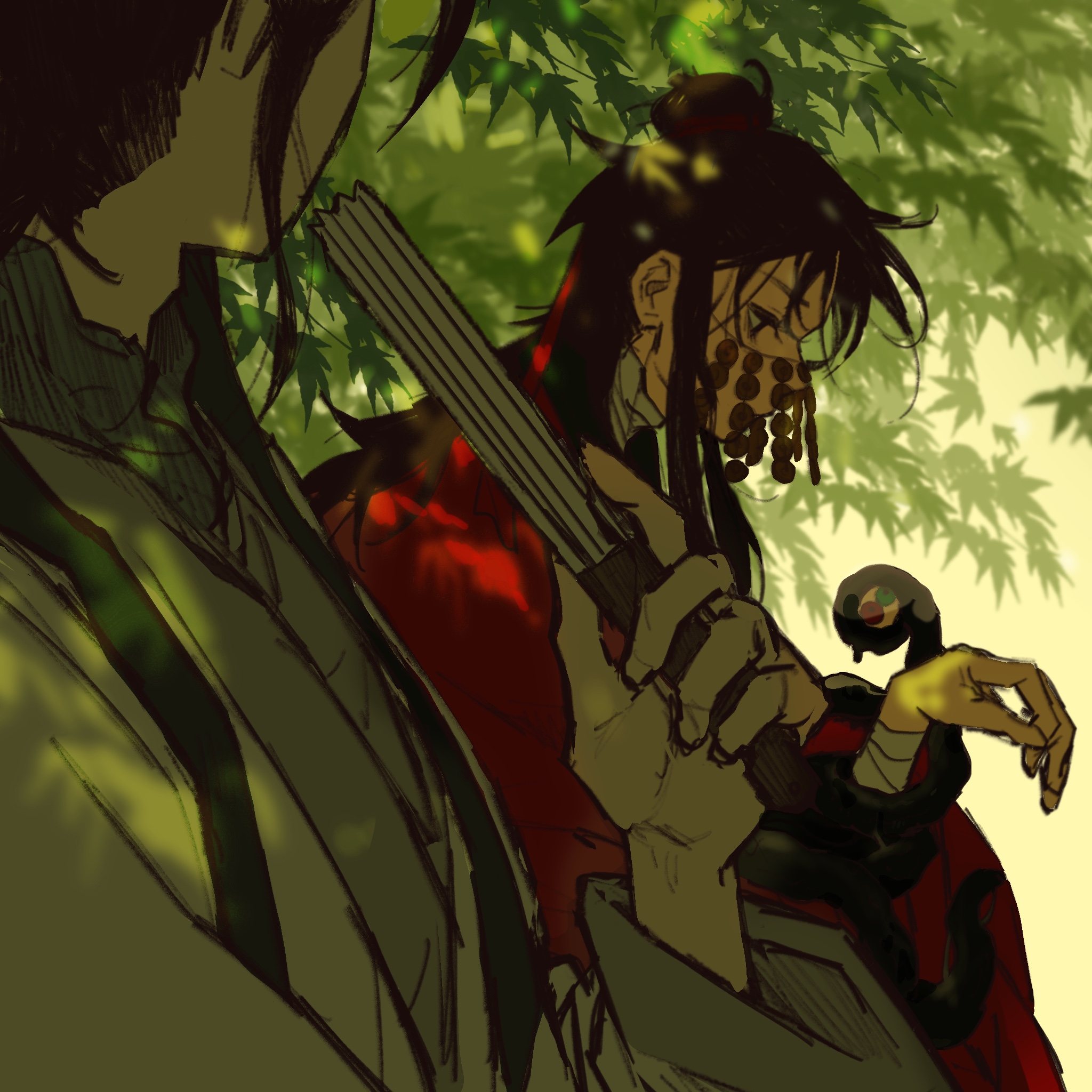 2boys bandaged_arm bandaged_neck bandages black_eyes black_hair chinese_clothes chinese_commentary coin coin_mask covered_mouth creature dao_gui_yi_xian dappled_sunlight eyeball folding_fan hair_bun hair_ribbon hand_fan hand_up hanfu highres holding holding_fan holed_coin leaf li_huowang li_sui_(tentacles) long_hair long_sleeves looking_at_another male_focus mask messy_hair mouth_veil multiple_boys outdoors profile red_hanfu red_ribbon ribbon robe shade single_hair_bun sunlight tentacles tree upper_body veil white_hanfu yaoi yuexuaier zhuge_yuan