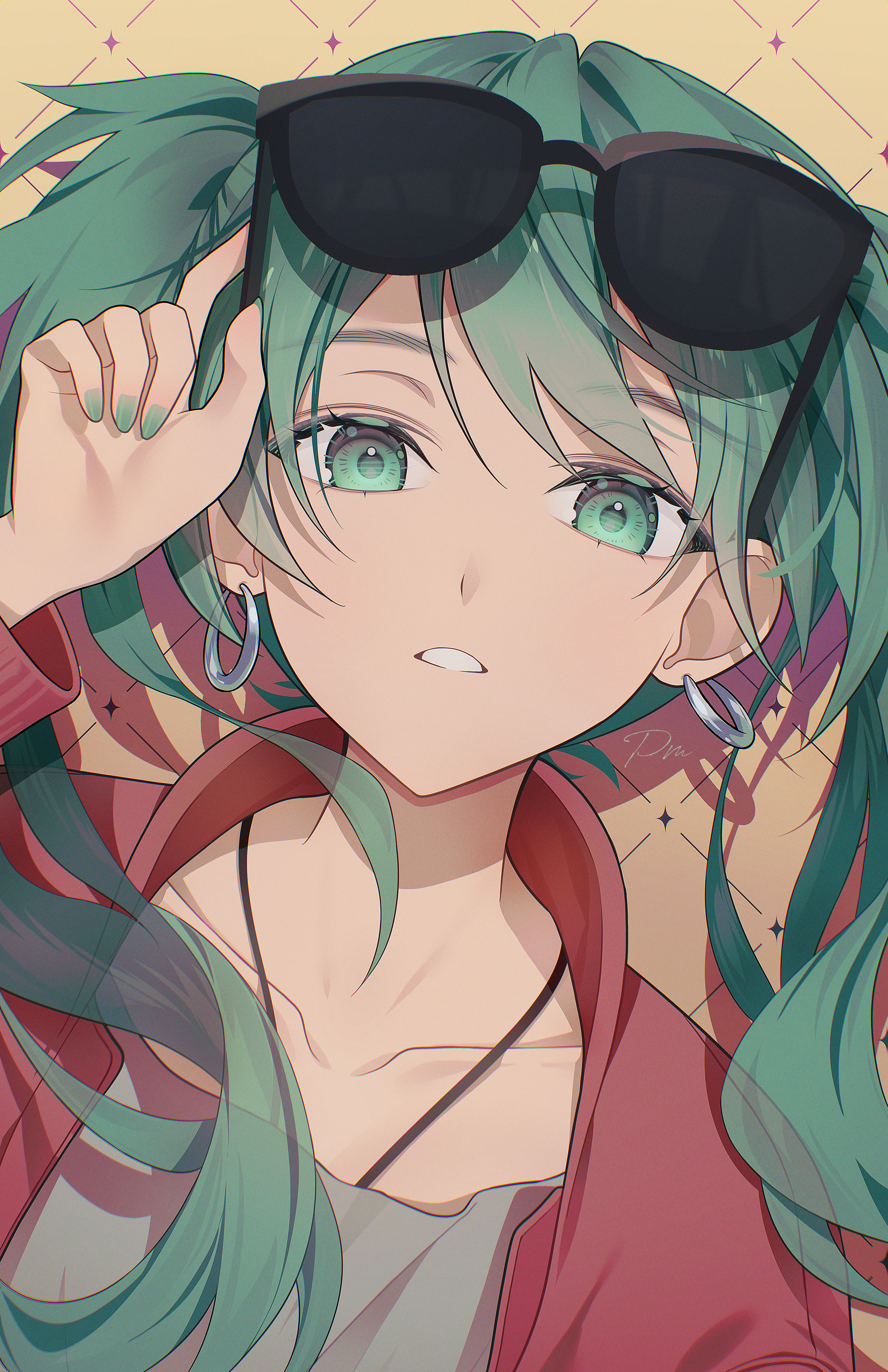 1girl absurdres adjusting_eyewear earrings green_eyes green_hair green_nails hatsune_miku highres jacket jewelry long_hair long_sleeves looking_at_viewer necklace open_mouth pm_(lily112100) red_jacket simple_background suna_no_wakusei_(vocaloid) sunglasses twintails vocaloid