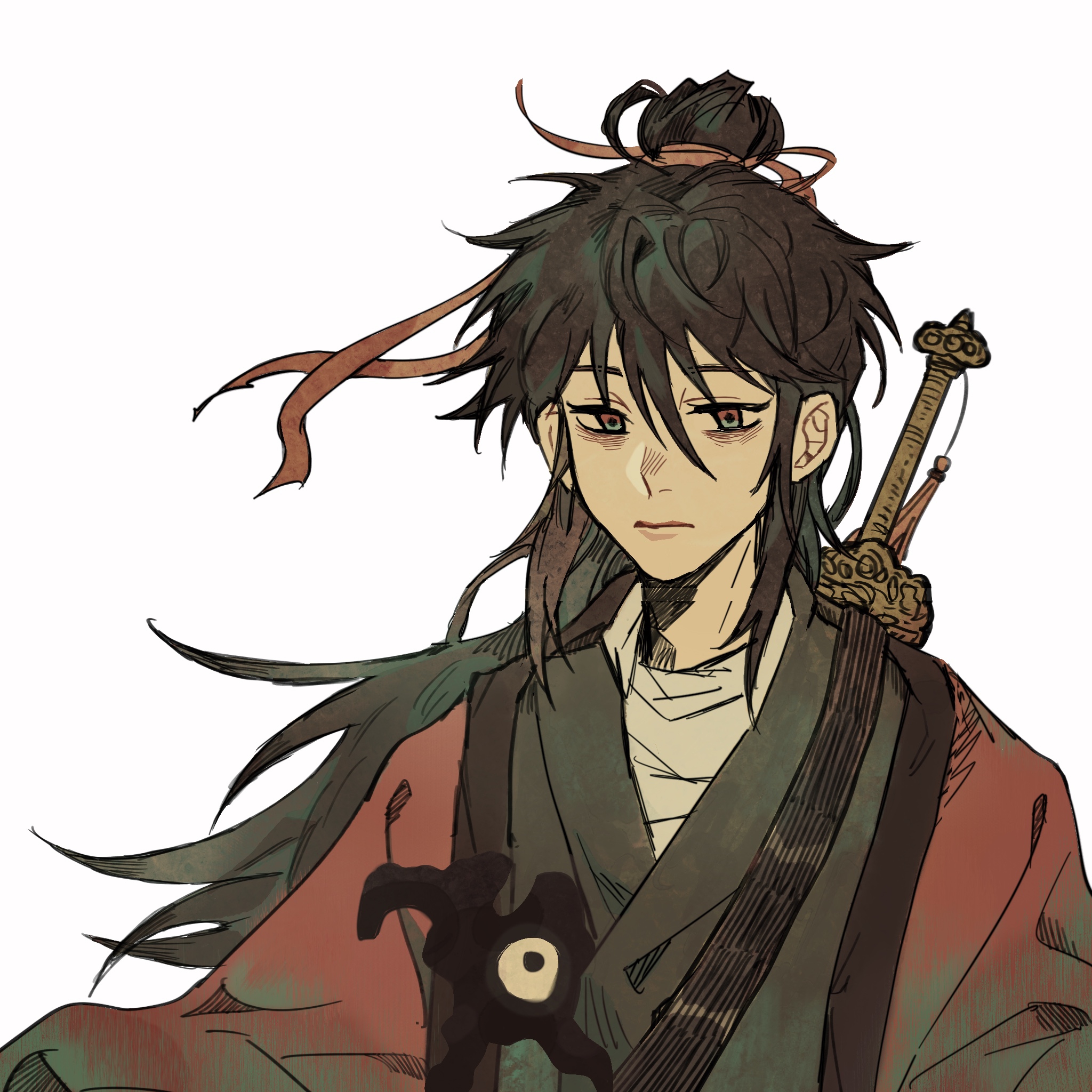 1boy bags_under_eyes bandaged_neck bandages black_hair black_hanfu chinese_clothes chinese_commentary closed_mouth coat creature dao_gui_yi_xian eyeball floating_hair hair_between_eyes hair_bun hair_ribbon hanfu highres li_huowang li_sui_(tentacles) long_hair looking_at_viewer male_focus red_coat red_eyes red_ribbon ribbon sheath sheathed simple_background single_hair_bun solo sword sword_on_back sword_tassel tassel upper_body weapon weapon_on_back weapon_tassel white_background yuexuaier