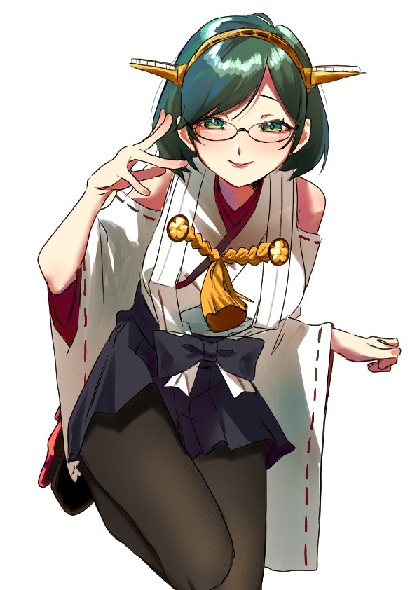 1girl black_hair black_pantyhose black_skirt cowboy_shot detached_sleeves green-framed_eyewear green_eyes hakama hakama_short_skirt hakama_skirt headgear japanese_clothes kantai_collection kirishima_(kancolle) pantyhose ribbon-trimmed_sleeves ribbon_trim short_hair simple_background skirt solo standing tone_gawa10 white_background