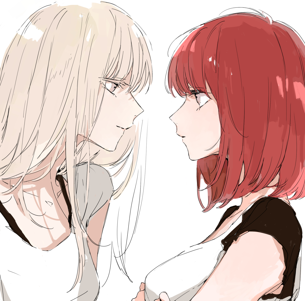 2girls blonde_hair expressionless eye_contact highres kakmxxxny06 kono_koi_wo_hoshi_ni_wa_negawanai long_hair looking_at_another medium_hair multiple_girls red_hair second-party_source simple_background staring