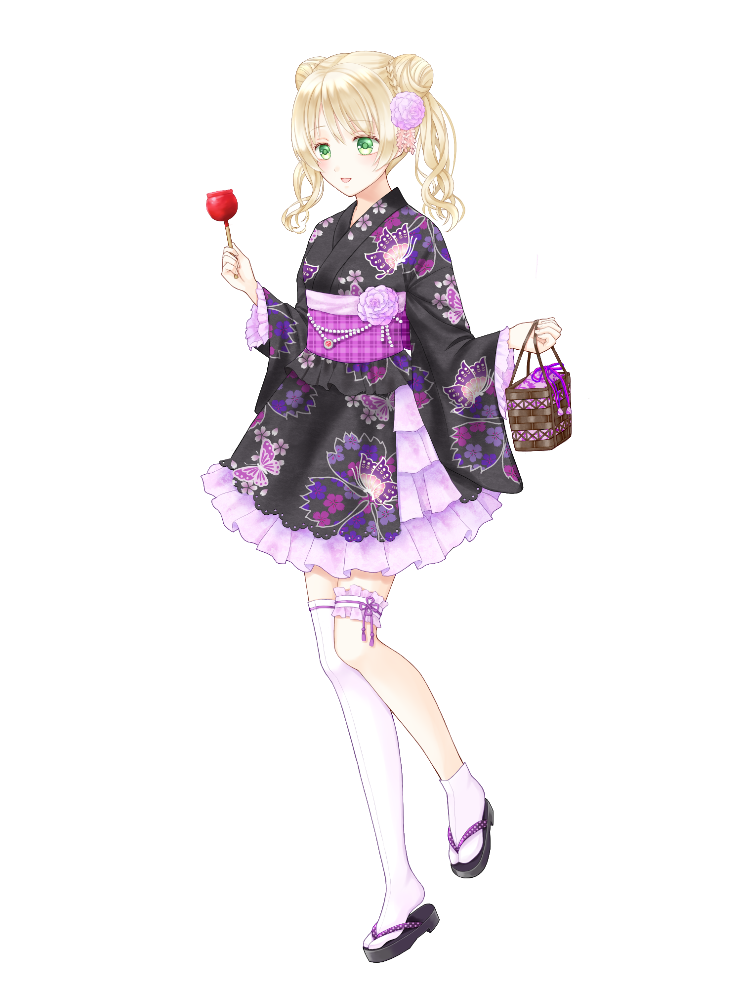 1girl braid braided_bun candy_apple chain_paradox chika_tsubana_(tw) double_bun flower food full_body green_eyes hair_bun hair_flower hair_ornament highres holding_candy_apple holding_food iris_testarossa japanese_clothes kimono kinchaku medium_hair obi pouch print_kimono sandals sash single_thighhigh solo standing thigh_strap thighhighs transparent_background twintails wide_sleeves