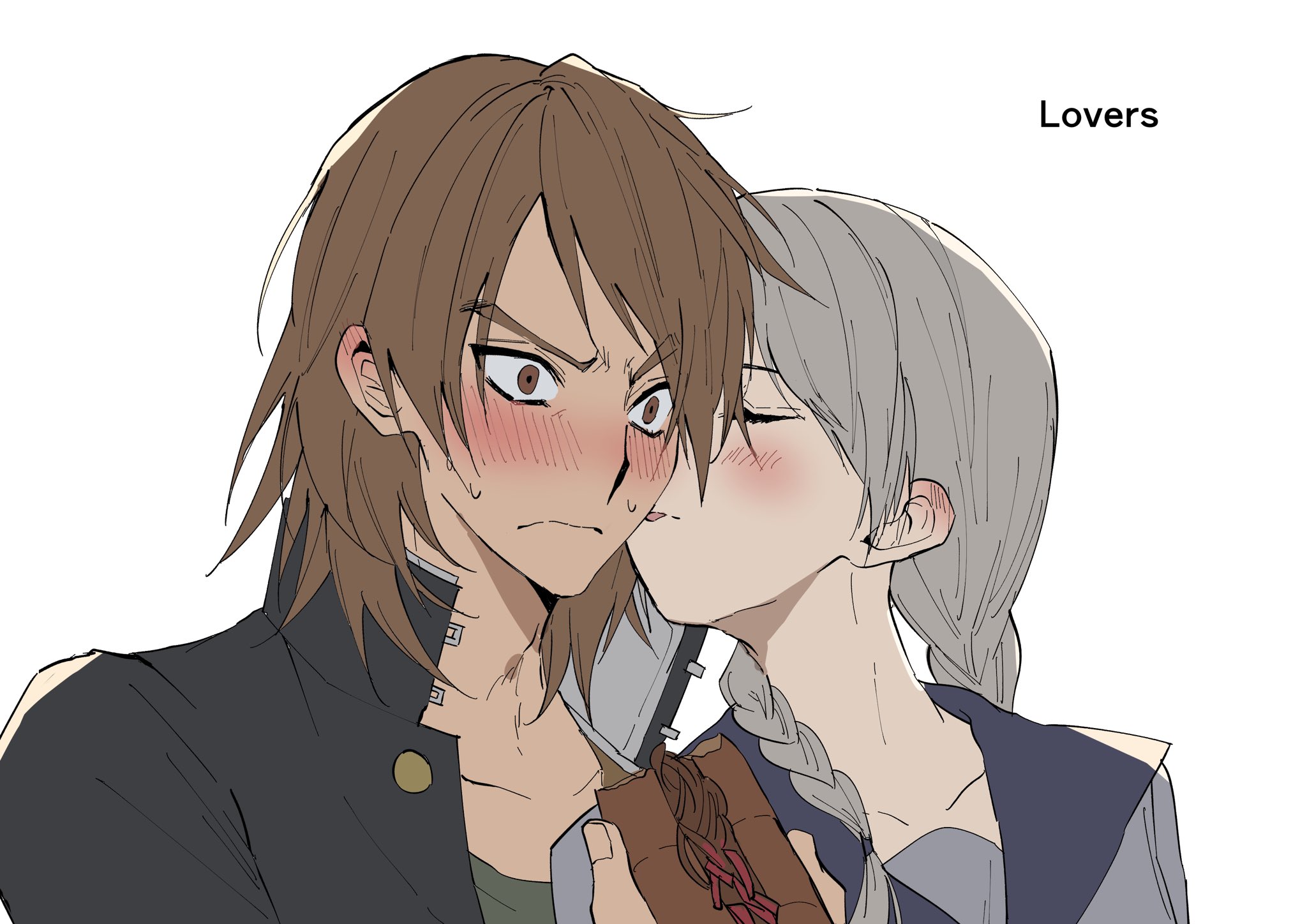 2boys blue_sailor_collar blush braid brown_eyes brown_hair closed_eyes ear_blush english_text gakuran grey_hair highres hijiyama_takatoshi juusan_kihei_bouei_ken kasukasugom1 licking licking_another's_cheek licking_another's_face long_hair male_focus medium_hair multiple_boys okino_tsukasa sailor_collar school_uniform serafuku shirt simple_background tongue tongue_out trap twin_braids upper_body white_background white_shirt wide-eyed yaoi