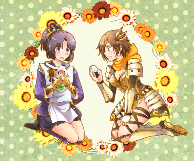 armor blush breasts brown_eyes brown_hair cleavage cross-laced_clothes cross-laced_legwear flower food hair_ornament hairpin hasuhiko japanese_clothes kimono kneeling legs leotard mori_ranmaru_(sengoku_musou) nene_(sengoku_musou) onigiri purple_eyes purple_hair scarf sengoku_musou shorts topknot yellow_scarf