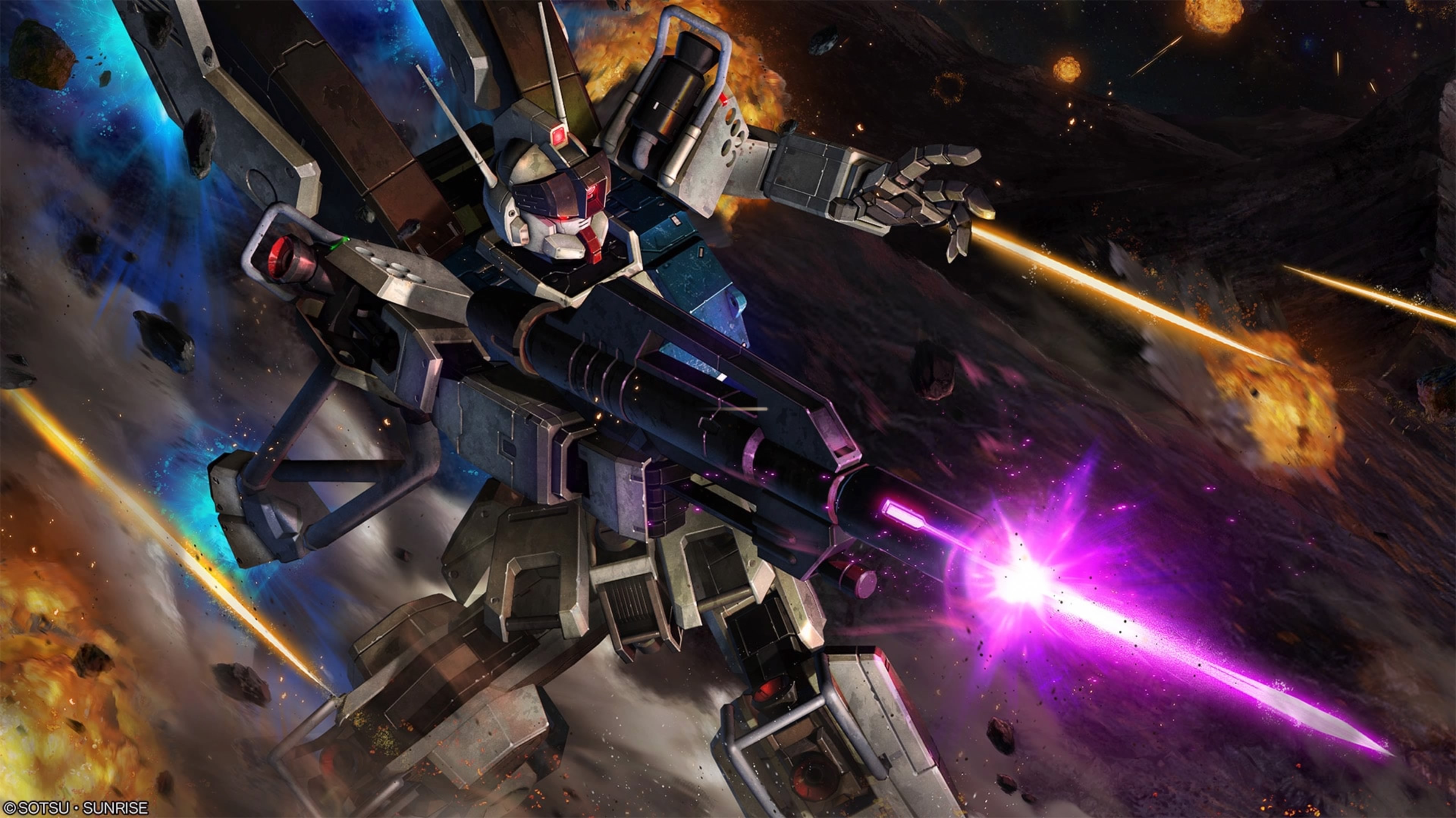 absurdres assault_visor asteroid battle beam_rifle copyright_logo debris energy_beam energy_gun explosion firing gundam gundam_battle_operation_2 gundam_ez8_high_mobility_custom highres logo machinery mecha mecha_focus mobile_suit no_humans painting_(medium) radio_antenna realistic robot scan science_fiction sd_gundam_g_generation space sunrise_(company) tenjin_hidetaka thrusters traditional_media vernier_thrusters weapon