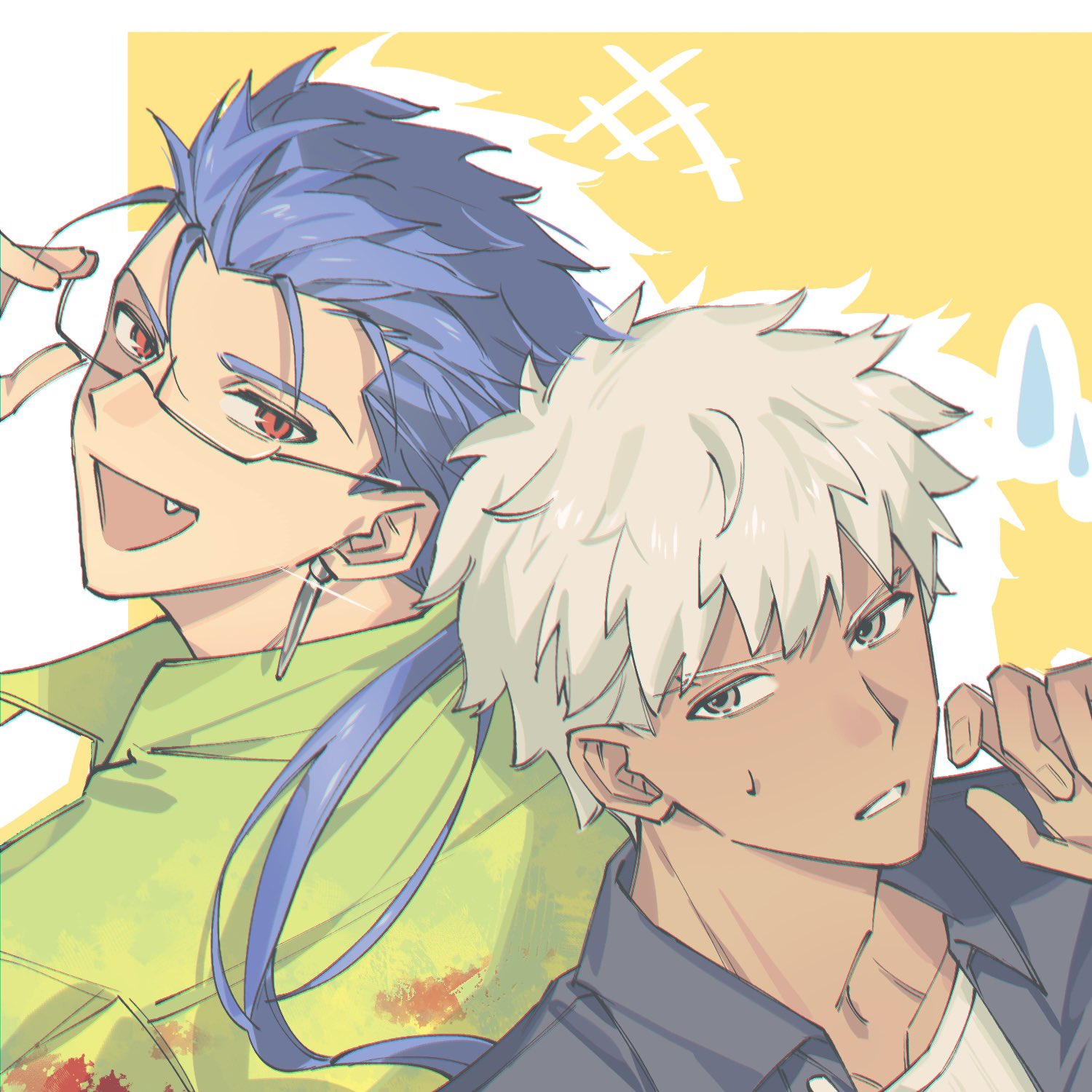 2boys archer_(fate) archer_(summer_casual)_(fate) back-to-back blue_hair commentary cu_chulainn_(aloha_shirt)_(fate) cu_chulainn_(fate) cu_chulainn_(lancer)_(fate) dark-skinned_male dark_skin fang fate/grand_order fate_(series) glasses grey_eyes highres male_focus multiple_boys official_alternate_costume open_mouth red_eyes smile sweatdrop untranslatable_commentary white_hair y1n