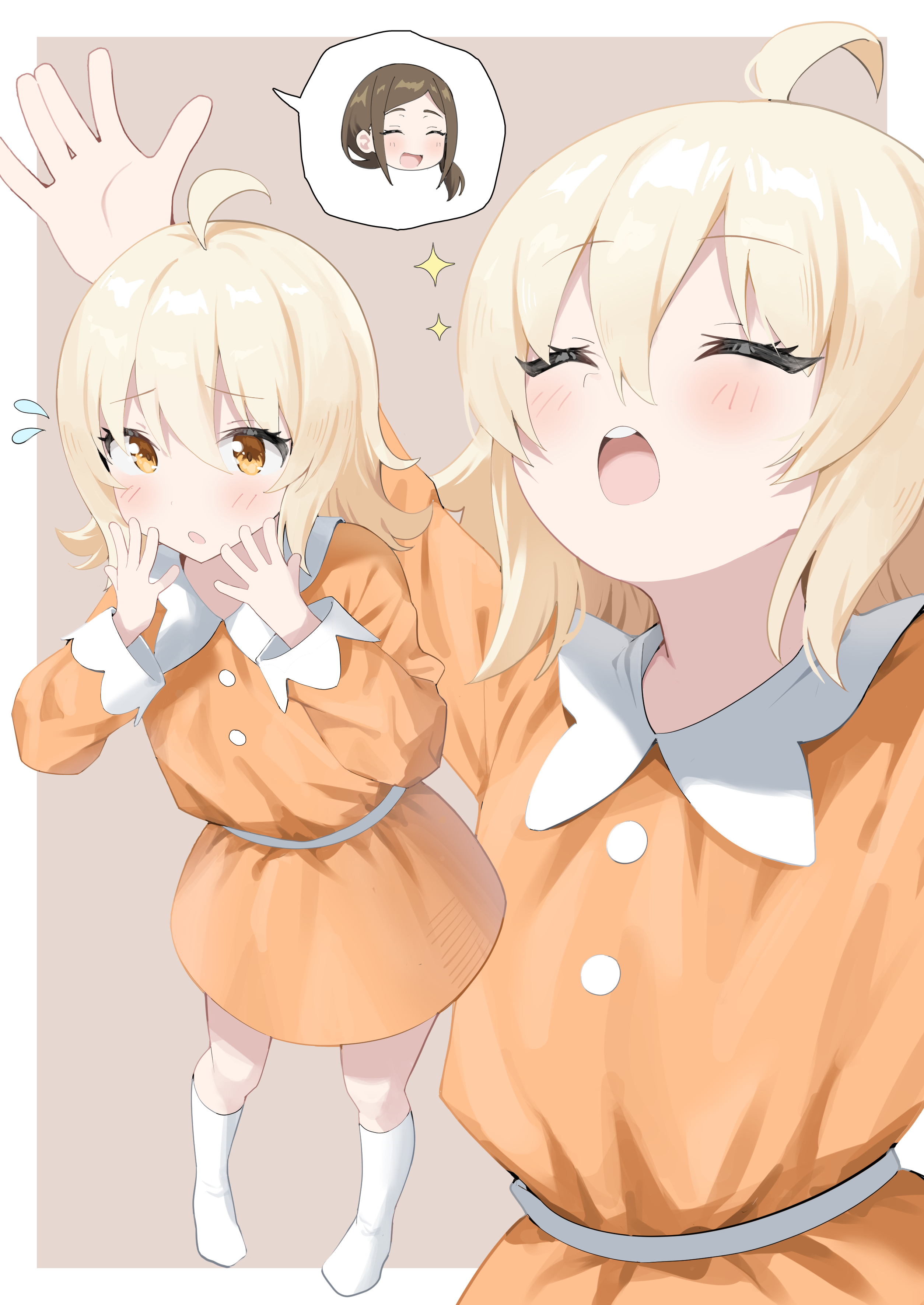 2girls absurdres aged_down ahoge blonde_hair blush brown_eyes brown_hair chibi chibi_inset child closed_eyes commentary dress flying_sweatdrops highres kawamoto_misato love_live! love_live!_nijigasaki_high_school_idol_club low_side_ponytail medium_hair miyashita_ai multiple_girls multiple_views open_mouth orange_dress side_ponytail smile socks sparkle white_socks yuu_(shampoohatslime)
