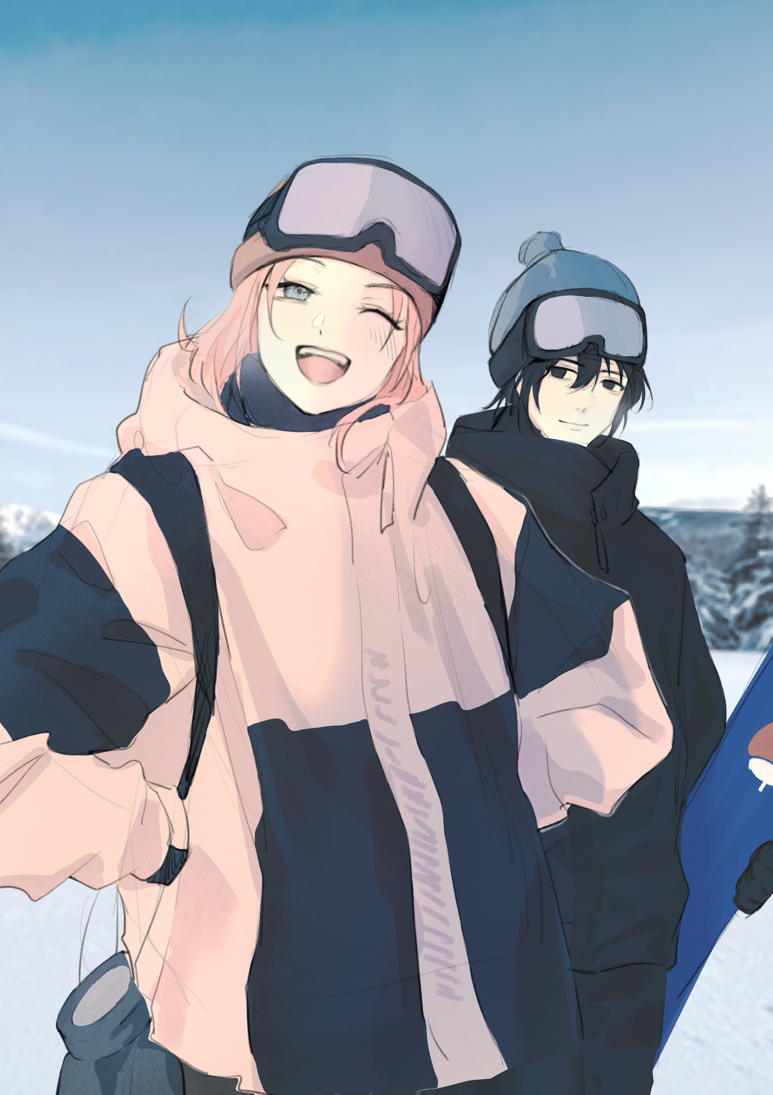 1boy 1girl bag beanie black_eyes black_hair black_jacket blurry blurry_background full_body gloves goggles goggles_on_head green_eyes hand_in_pocket haruno_sakura hat highres holding_snowboard jacket looking_at_another looking_at_viewer naruto_(series) one_eye_closed open_mouth outdoors pink_hair pink_jacket renyiyigeren short_hair simple_background ski_goggles sky smile snowboard uchiha_sasuke uchiha_symbol winter_clothes