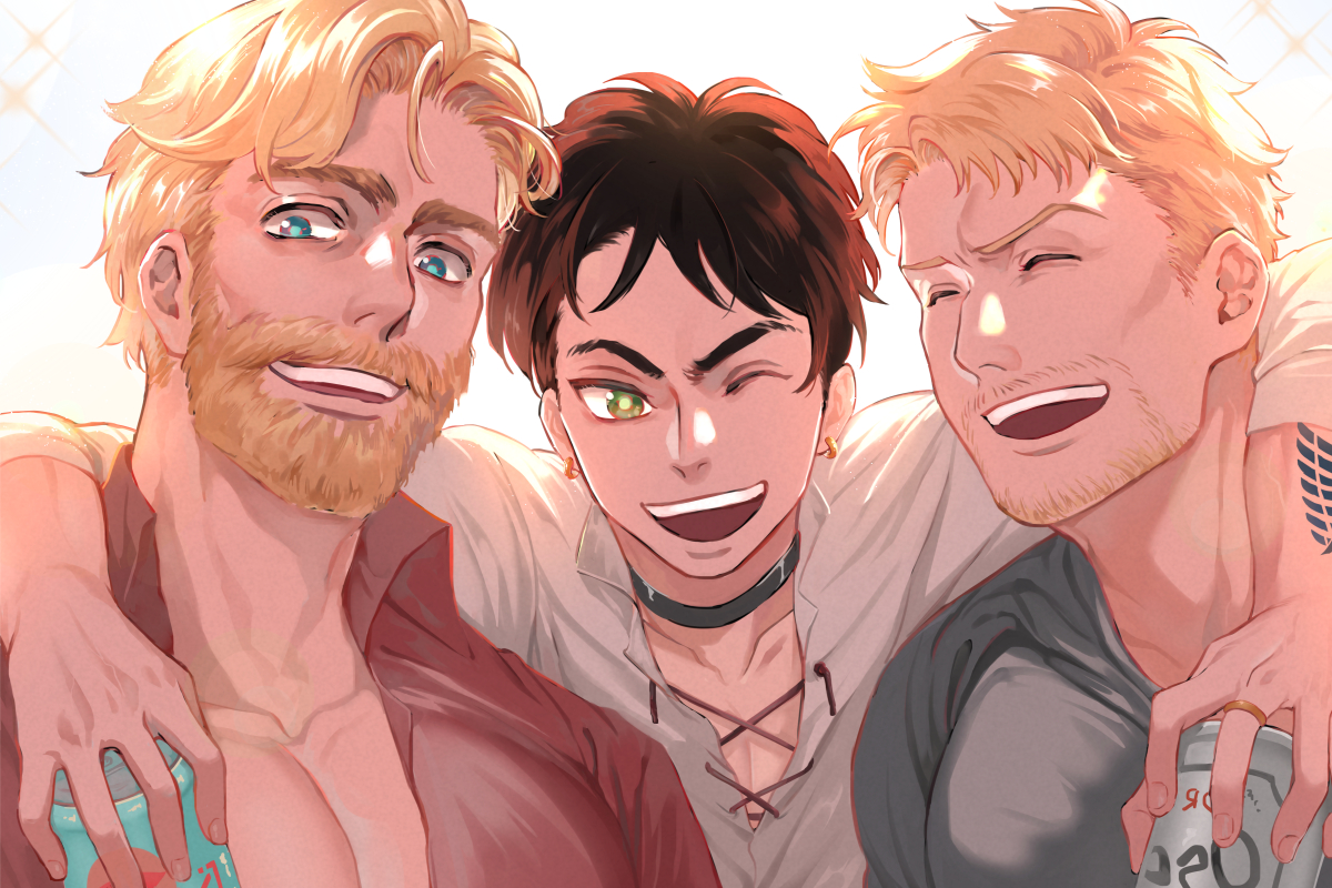 3boys :d arm_on_another's_shoulder backlighting beard beer_can black_choker blonde_hair boy_sandwich brothers can choker commentary_request drink_can earrings eren_yeager facial_hair glasses goatee_stubble green_eyes half-siblings happy holding holding_can jewelry male_focus mature_male multiple_boys one_eye_closed open_mouth pectoral_cleavage pectorals reiner_braun sandwiched shiba44469 shingeki_no_kyojin shirt short_hair siblings smile stubble t-shirt thick_eyebrows upper_body zeke_yeager