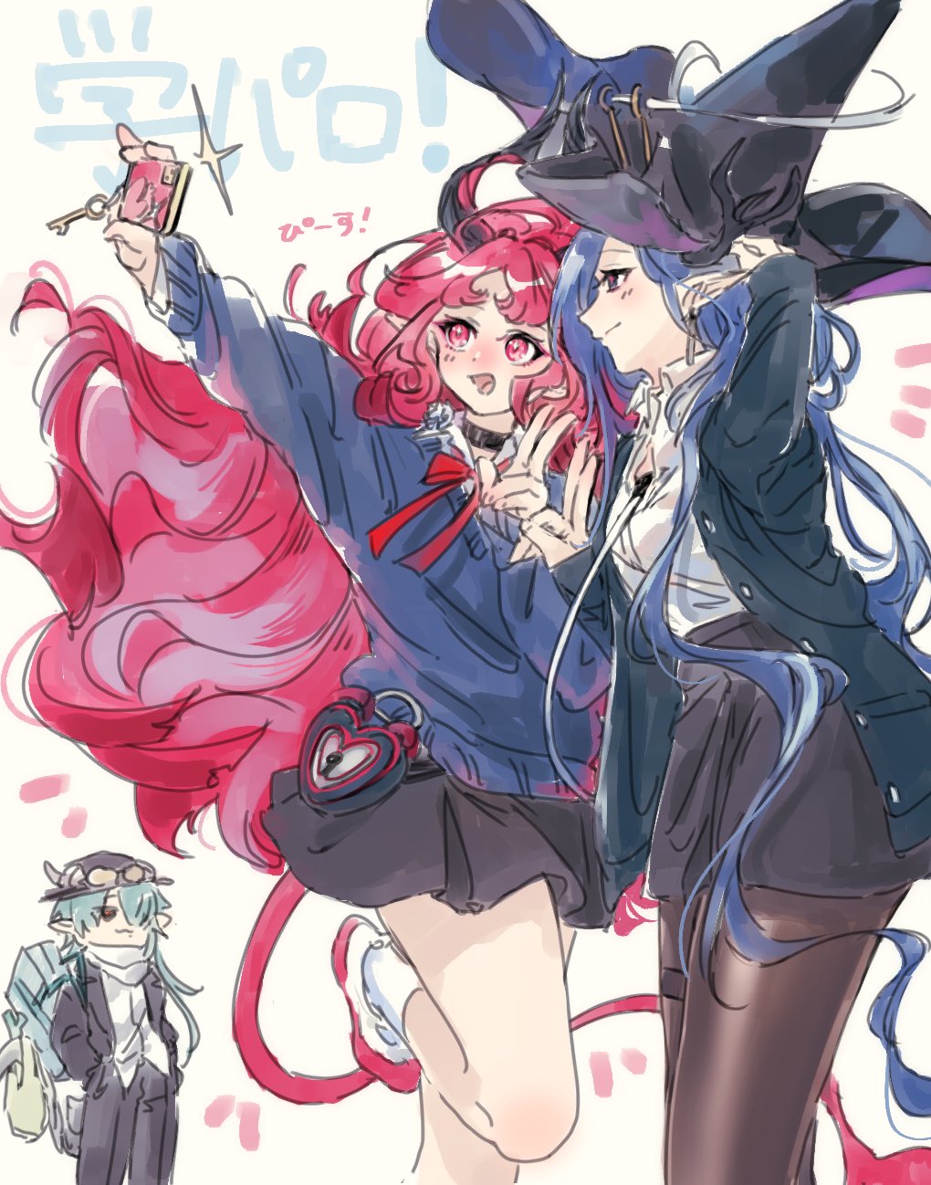 1boy 2girls arknights cellphone ermengarde_(arknights) hat highres horns long_hair mitm_(arknights) multiple_girls nymph_(arknights) peace_symbol phone pink_eyes pink_hair school_uniform selfie serafuku smartphone very_long_hair witch_hat