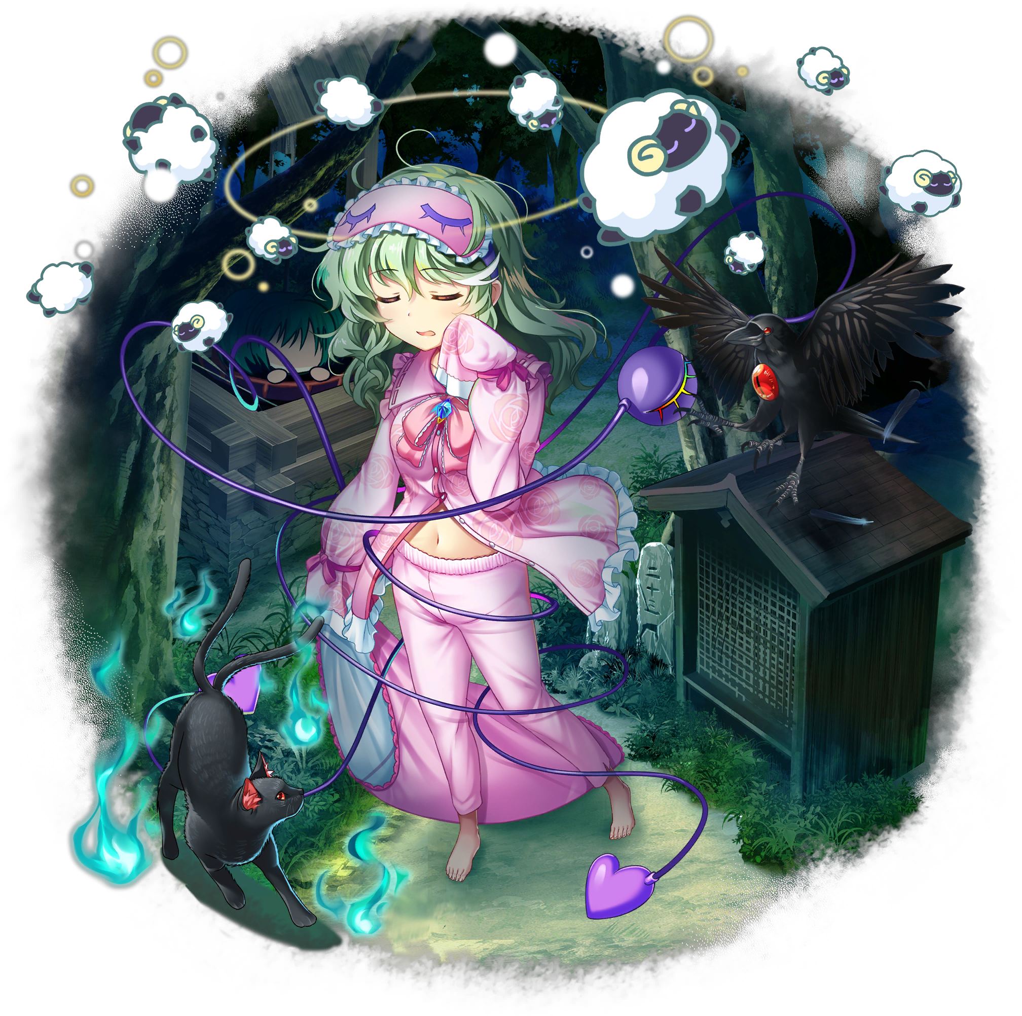 2girls alternate_costume barefoot bird black_cat bow bowtie breasts cat closed_eyes collared_shirt eyeball floral_print forest frilled_shirt frilled_shirt_collar frilled_sleeves frills game_cg green_hair heart heart_of_string highres holding holding_pillow in_container kaenbyou_rin kaenbyou_rin_(cat) kisume komeiji_koishi komeiji_koishi_(the_wandering_rose) long_hair long_sleeves looking_at_viewer mask mask_on_head multiple_girls multiple_tails nature navel no_eyes no_mouth official_art open_mouth outdoors pajamas pants pillow pink_bow pink_bowtie pink_pajamas pink_pants pink_shirt print_shirt reiuji_utsuho reiuji_utsuho_(bird) rose_print rotte_(1109) sheep shirt sleep_mask sleepy sleeves_past_fingers sleeves_past_wrists solo_focus tail third-party_source third_eye chest_eye toes touhou touhou_lostword transparent_background two_tails