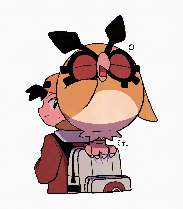 1boy alternate_color backpack bag bird black_eyes black_hair closed_mouth commentary_request ethan_(pokemon) gen_2_pokemon grey_bag hat hoothoot jacket male_focus nintendo pokemon pokemon_(creature) pokemon_gold/silver/crystal red_jacket shiny_pokemon short_hair simple_background smile squeans sweatdrop tyako_089 white_background yellow_hat