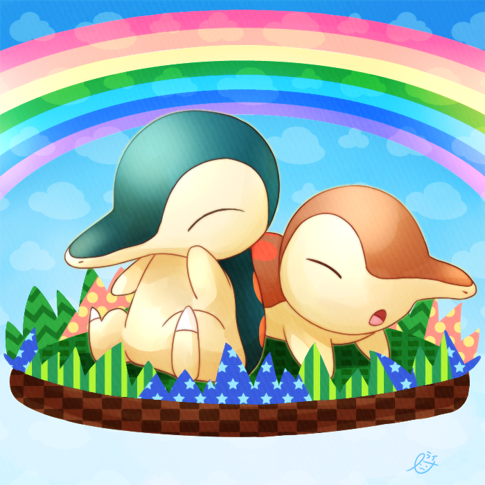 alternate_color animal_focus closed_eyes cyndaquil day full_body gen_2_pokemon gradient_background lai_(pixiv1814979) nintendo no_humans nostrils open_mouth outdoors pokemon pokemon_(creature) rainbow shiny_and_normal shiny_pokemon signature sitting