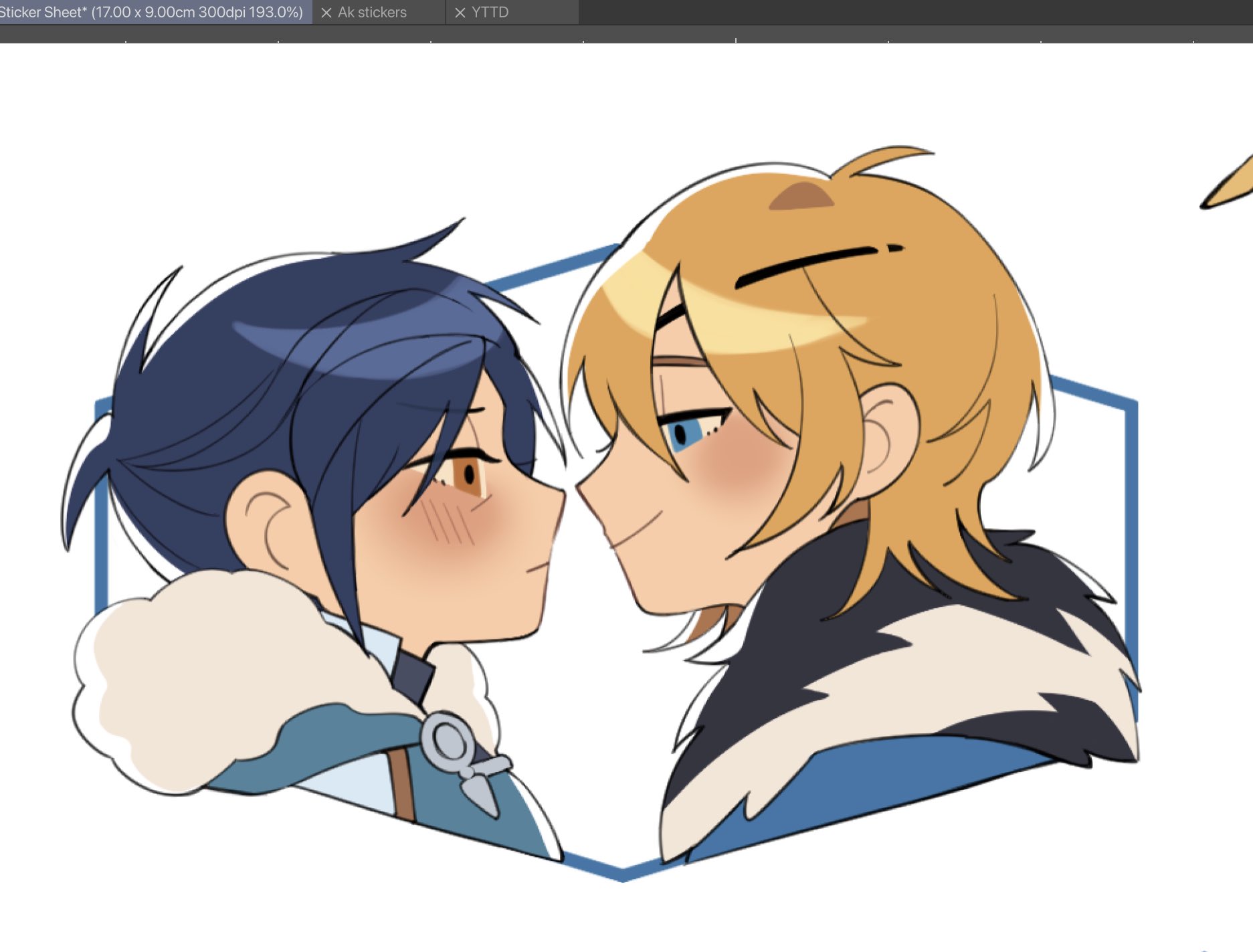 2boys aqua_cape art_program_in_frame blonde_hair blue_cape blue_eyes blue_hair blush cape closed_mouth commentary cropped_shoulders dimitri_alexandre_blaiddyd dimitri_alexandre_blaiddyd_(timeskip) english_commentary eye_contact eyepatch felix_hugo_fraldarius felix_hugo_fraldarius_(timeskip) fire_emblem fire_emblem:_three_houses foxkunkun fur-trimmed_cape fur-trimmed_hood fur_trim hair_behind_ear highres hood hood_down hooded_cape looking_at_another male_focus multiple_boys nintendo orange_eyes profile simple_background smile white_background yaoi