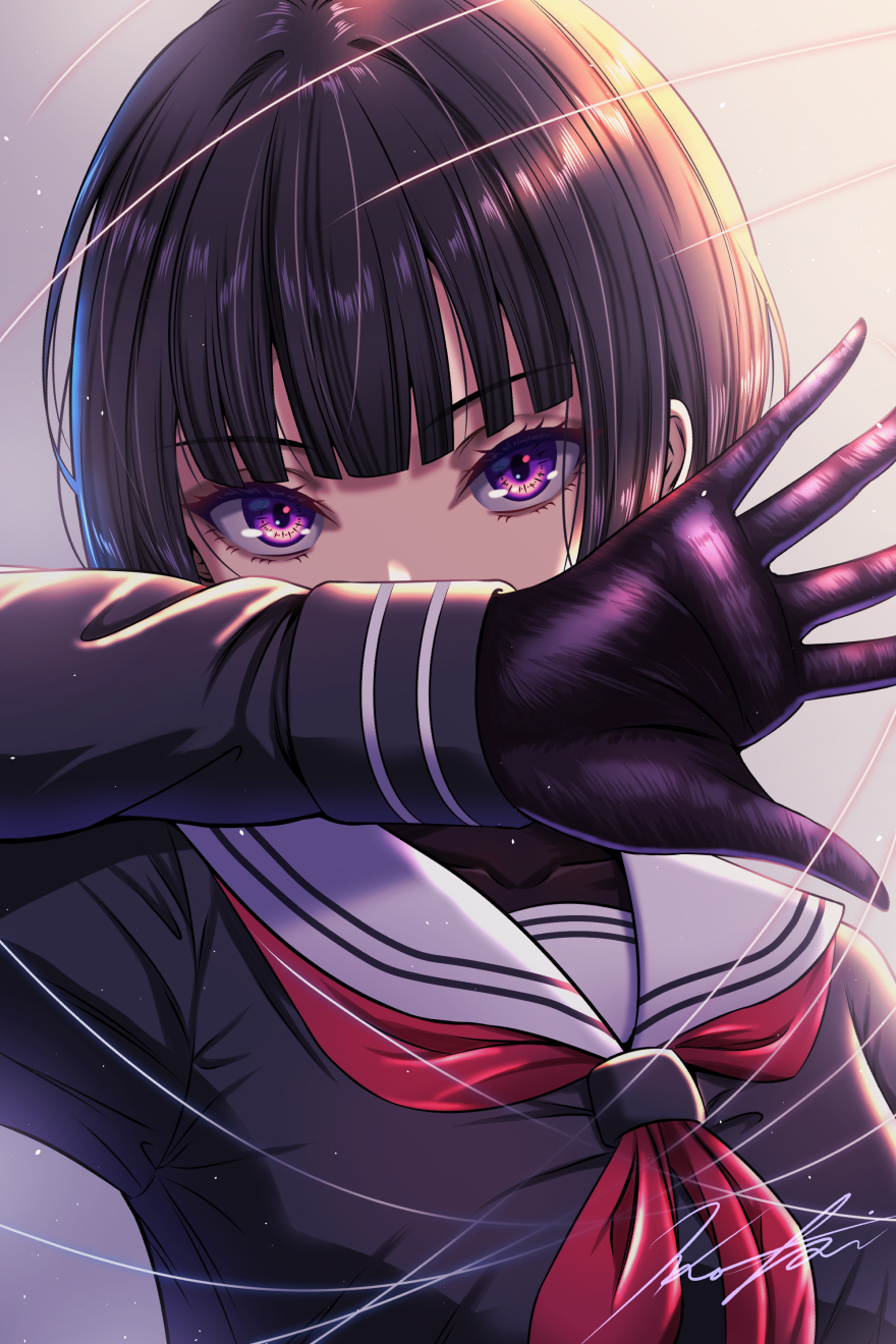 1girl arm_up black_bodystocking black_hair black_shirt blunt_bangs bodystocking commentary covered_mouth highres idolmaster idolmaster_cinderella_girls koya_(koya_x_00) long_sleeves looking_at_viewer neckerchief open_hand purple_eyes red_neckerchief sailor_collar shirayuki_chiyo shirt sidelighting signature solo upper_body white_sailor_collar