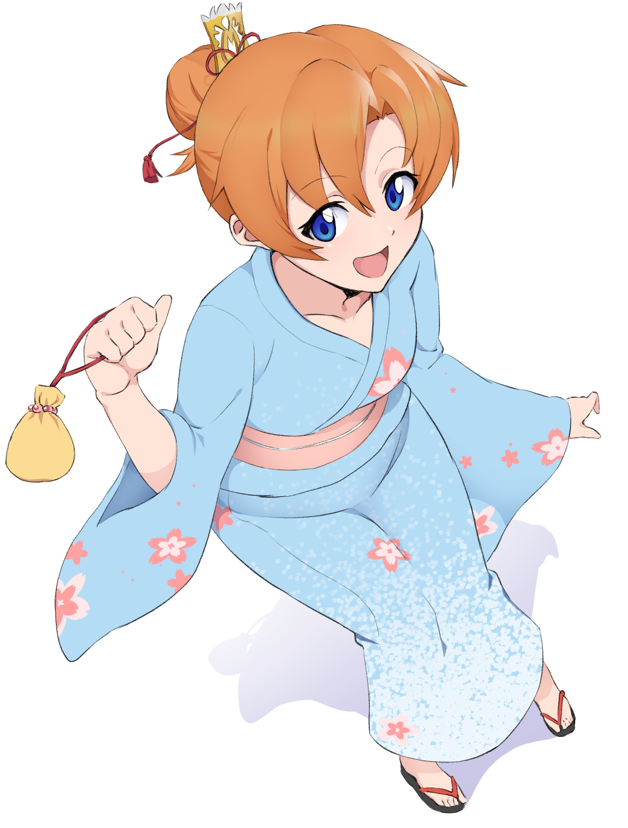 1girl alternate_costume alternate_hairstyle arm_up bag blue_eyes blue_kimono floral_print floral_print_kimono foreshortening from_above full_body hair_bun hair_ribbon highres higurashi_no_naku_koro_ni holding holding_bag japanese_clothes kimono long_sleeves looking_at_object money_bag monstermilk obi open_mouth orange_hair parted_bangs print_kimono red_ribbon ribbon ryuuguu_rena sandals sash shadow simple_background smile solo white_background wide_sleeves zouri