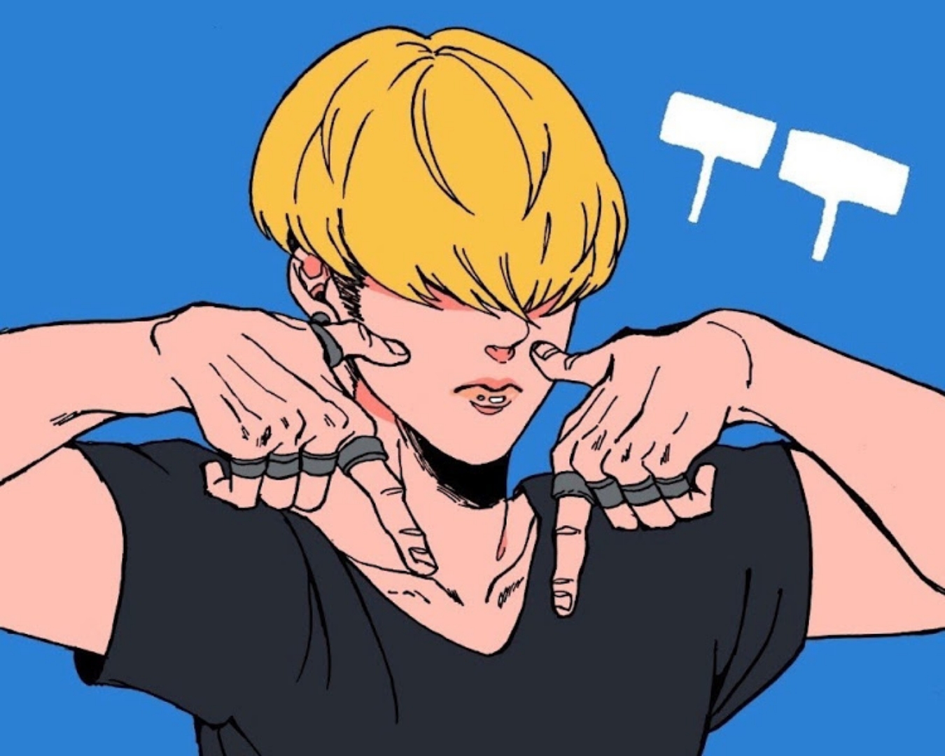 1boy akiyukke_0120 arms_up black_hair black_shirt blonde_hair blue_background closed_mouth ear_piercing hong_jae-yeol jewelry k-pop lookism male_focus medium_hair multicolored_hair piercing ring shirt simple_background tt_(twice) twice_(group) two-tone_hair