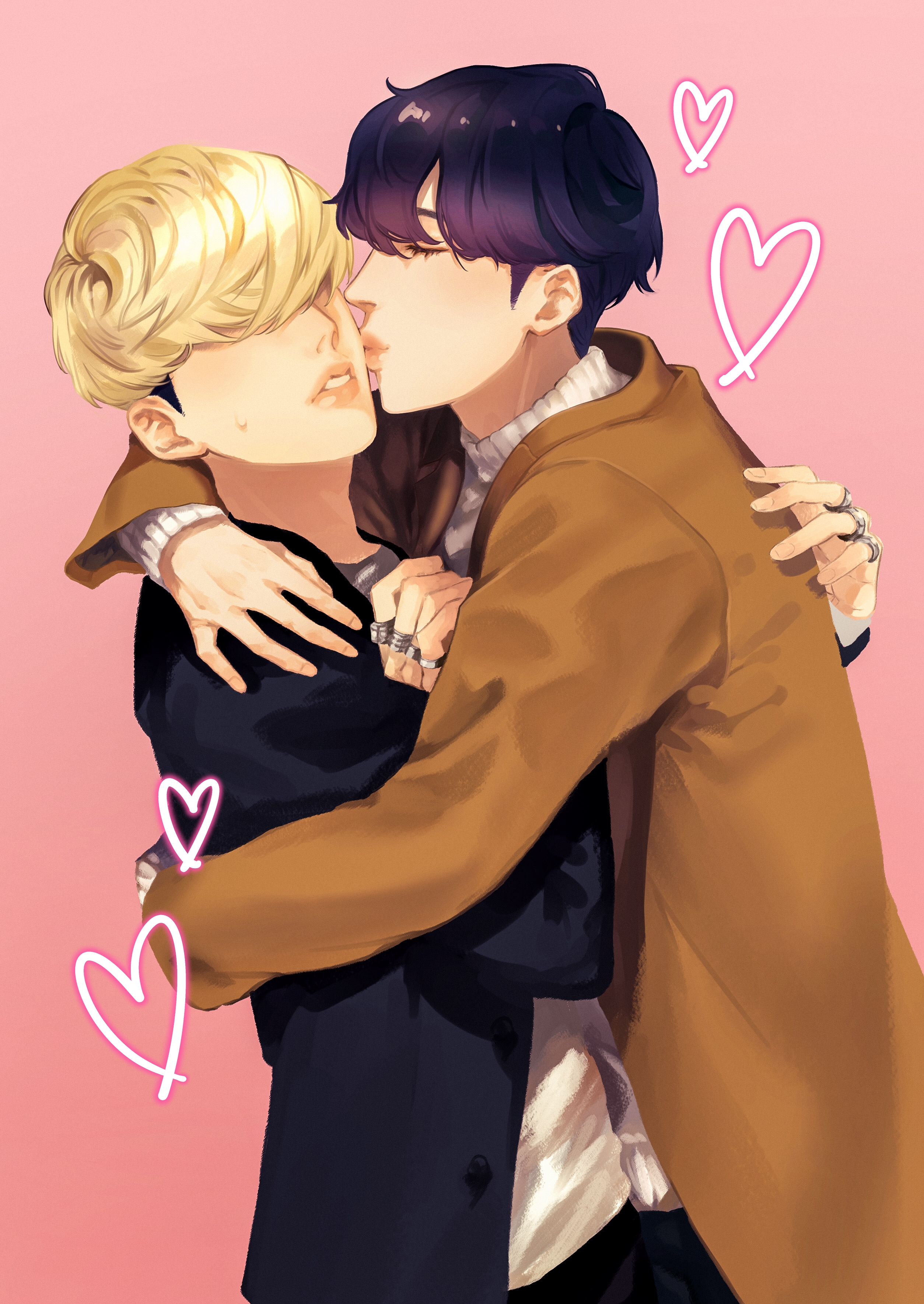 2boys absurdres black_hair black_jacket blonde_hair brown_jacket closed_eyes facing_another hair_over_eyes heart highres hong_jae-yeol hug jacket jewelry kino_houki lookism male_focus multiple_boys park_hyung-suk parted_lips pink_background ring short_hair standing sweatdrop yaoi