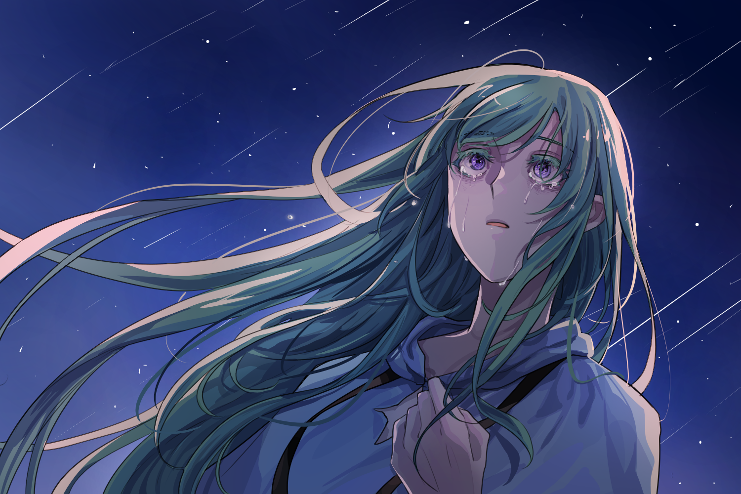 1boy commentary_request crying enkidu_(fate) fate/grand_order fate_(series) green_hair kassia kingu_(fate) korean_commentary long_hair male_focus parted_lips portrait purple_eyes robe shooting_star sky solo star_(sky) starry_sky streaming_tears tears white_robe