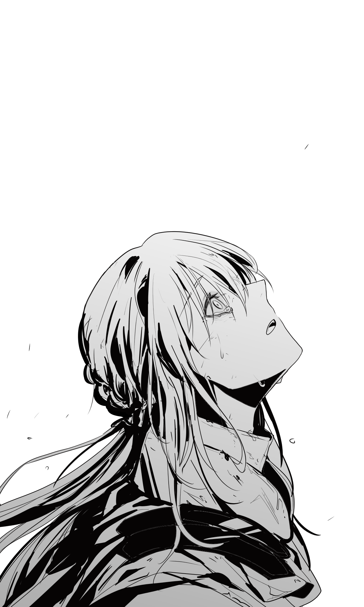 1boy bedivere_(fate) commentary_request crying fate/grand_order fate_(series) from_side greyscale highres kassia korean_commentary long_hair looking_up male_focus monochrome open_mouth ponytail portrait solo tears