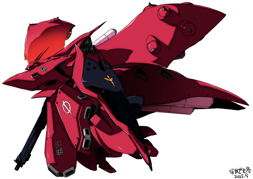 antennae beam_rifle char's_counterattack char's_counterattack_-_beltorchika's_children commentary dated energy_gun glowing glowing_eye gun gundam holding holding_gun holding_weapon mecha mobile_suit nakazaki_tou nightingale_(gundam) no_humans one-eyed pink_eyes robot science_fiction shield signature solo thrusters weapon white_background