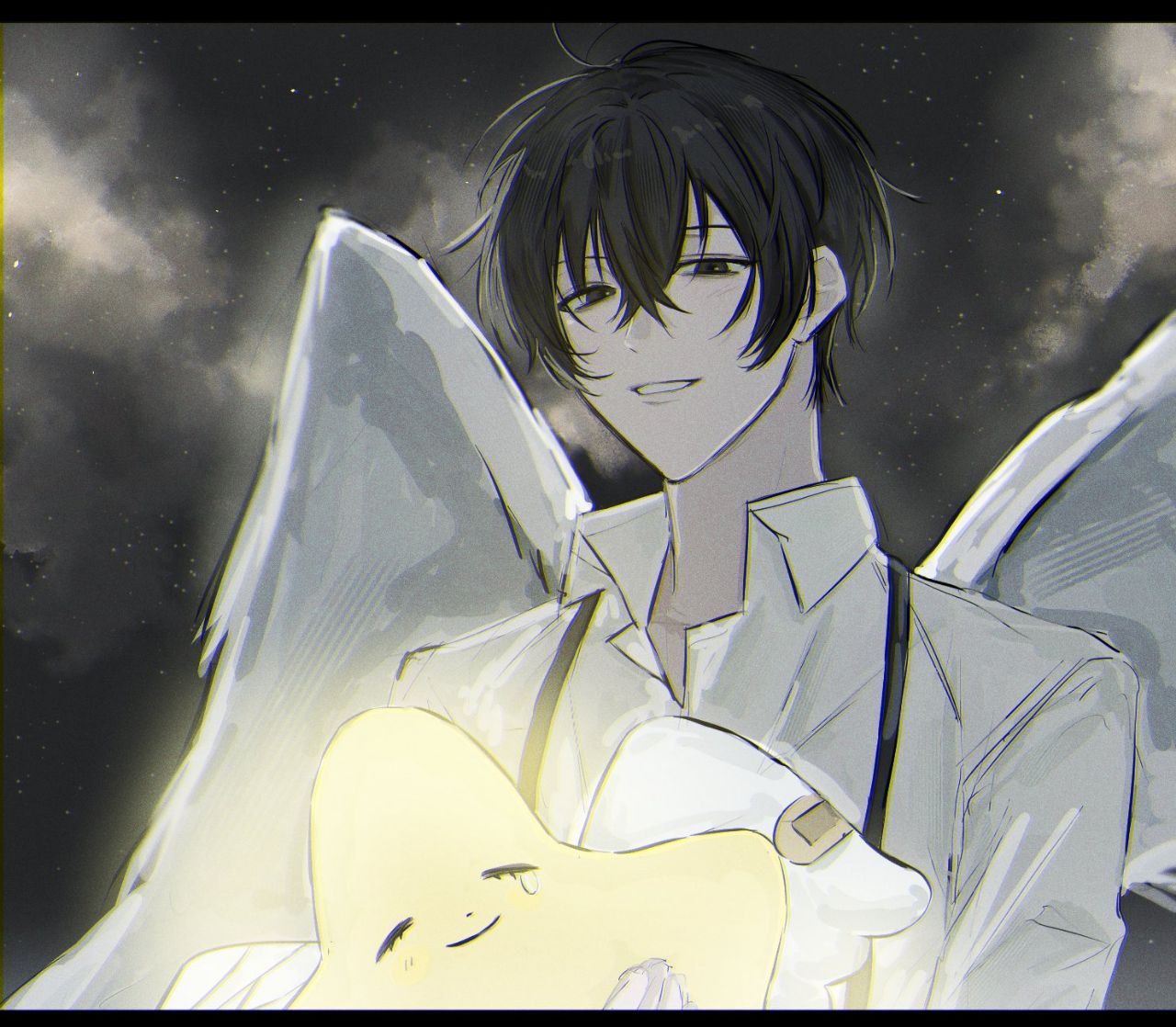 1boy black_eyes black_hair cloud collared_shirt feathered_wings holding holding_star hugging_object jugiii12 limbus_company long_sleeves looking_at_viewer night open_mouth project_moon shirt short_hair sky smile solo star_(sky) star_(symbol) starry_sky stuffed_toy suspender_pants third-party_source white_shirt wings yi_sang_(project_moon)