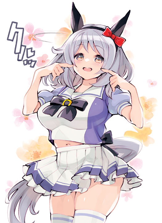 1girl animal_ears breasts brown_eyes commentary_request grey_hair hair_between_eyes hair_ornament hairband hishi_miracle_(umamusume) horse_ears horse_girl horse_tail looking_at_viewer medium_breasts medium_hair navel open_mouth pointing pointing_at_self ribbon ryoji_(nomura_ryouji) school_uniform solo tail thighhighs tracen_school_uniform umamusume