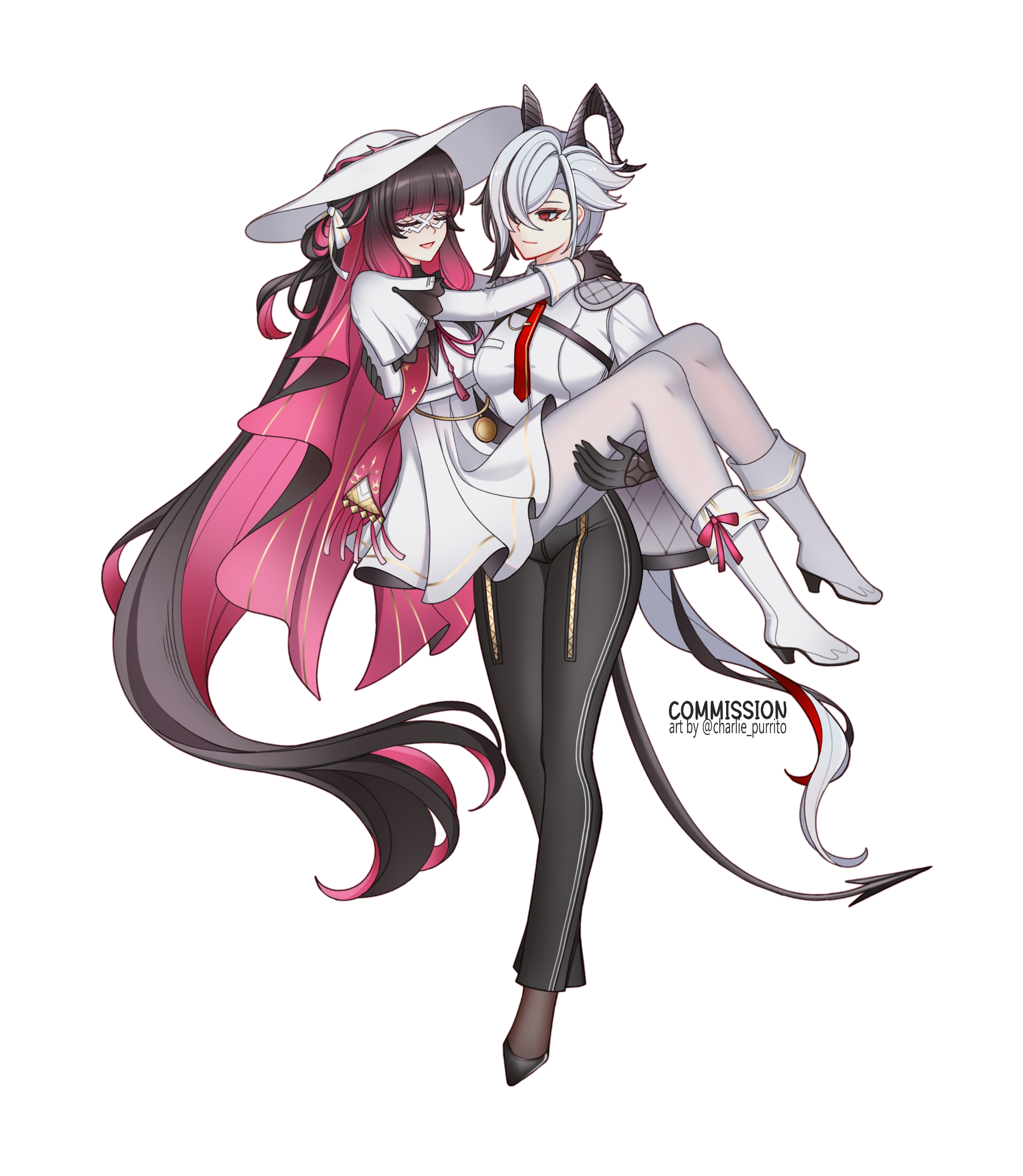 2girls absurdres ankle_boots arlecchino_(genshin_impact) arm_around_neck artist_name black_gloves black_hair black_horns black_jacket black_pants black_shoes black_tail boots breasts carrying charlie_purrito chest_harness closed_eyes closed_mouth columbina_(genshin_impact) commentary commission cosplay curled_horns demon_tail english_commentary eye_mask full_body genshin_impact gloves hair_over_one_eye hair_ribbon harness hat high-waist_skirt highres horns jacket jacket_on_shoulders large_breasts long_hair long_sleeves looking_at_another mask multicolored_hair multiple_girls necktie pants pantyhose phoebe_(wuthering_waves) phoebe_(wuthering_waves)_(cosplay) pink_hair princess_carry red_eyes red_necktie red_sash ribbon sash shirt shoes simple_background skirt smile tail two-tone_hair very_long_hair white_background white_boots white_hair white_hat white_pantyhose white_ribbon white_shirt white_skirt wuthering_waves yuri zani_(wuthering_waves) zani_(wuthering_waves)_(cosplay)