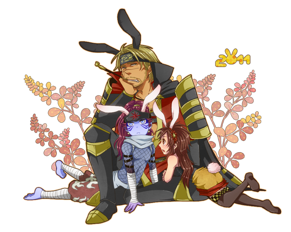 1boy armor batako_(artist) blonde_hair brown_eyes coat facial_hair fishnet_top fishnets fuma_kotaro_(sengoku_musou) hand_on_own_hip headband hojo_ujiyasu_(sengoku_musou) jewelry kai_(sengoku_musou) kotaro_fuuma long_hair male_focus necklace ponytail rabbit_ears rabbit_tail red_hair scar sengoku_musou skirt smoking_pipe stubble thighhighs